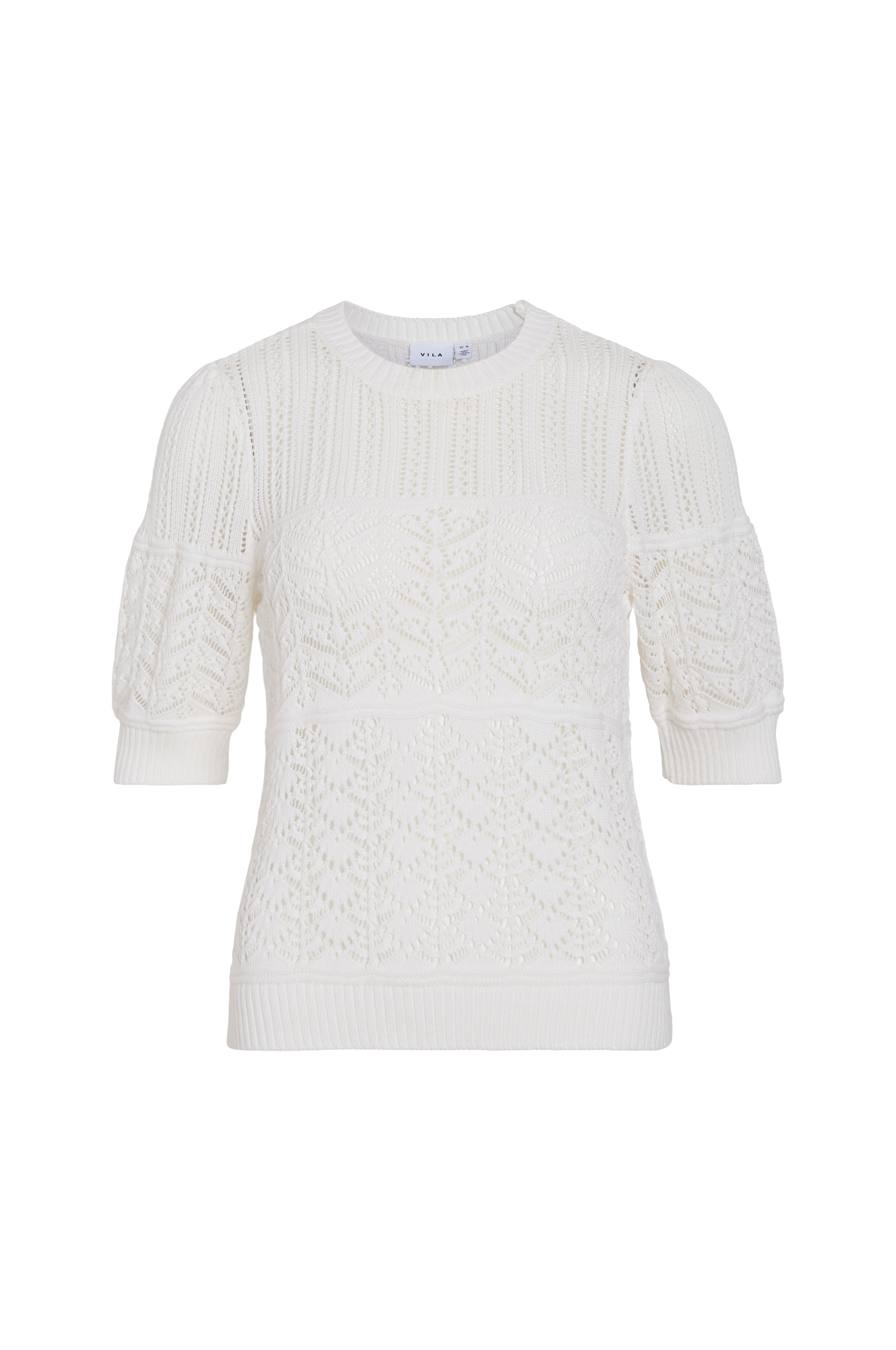 • Lige, mønsterstrikket model• Bred halsudskæring• Kort ballonærme• Ribstrikkede kanter