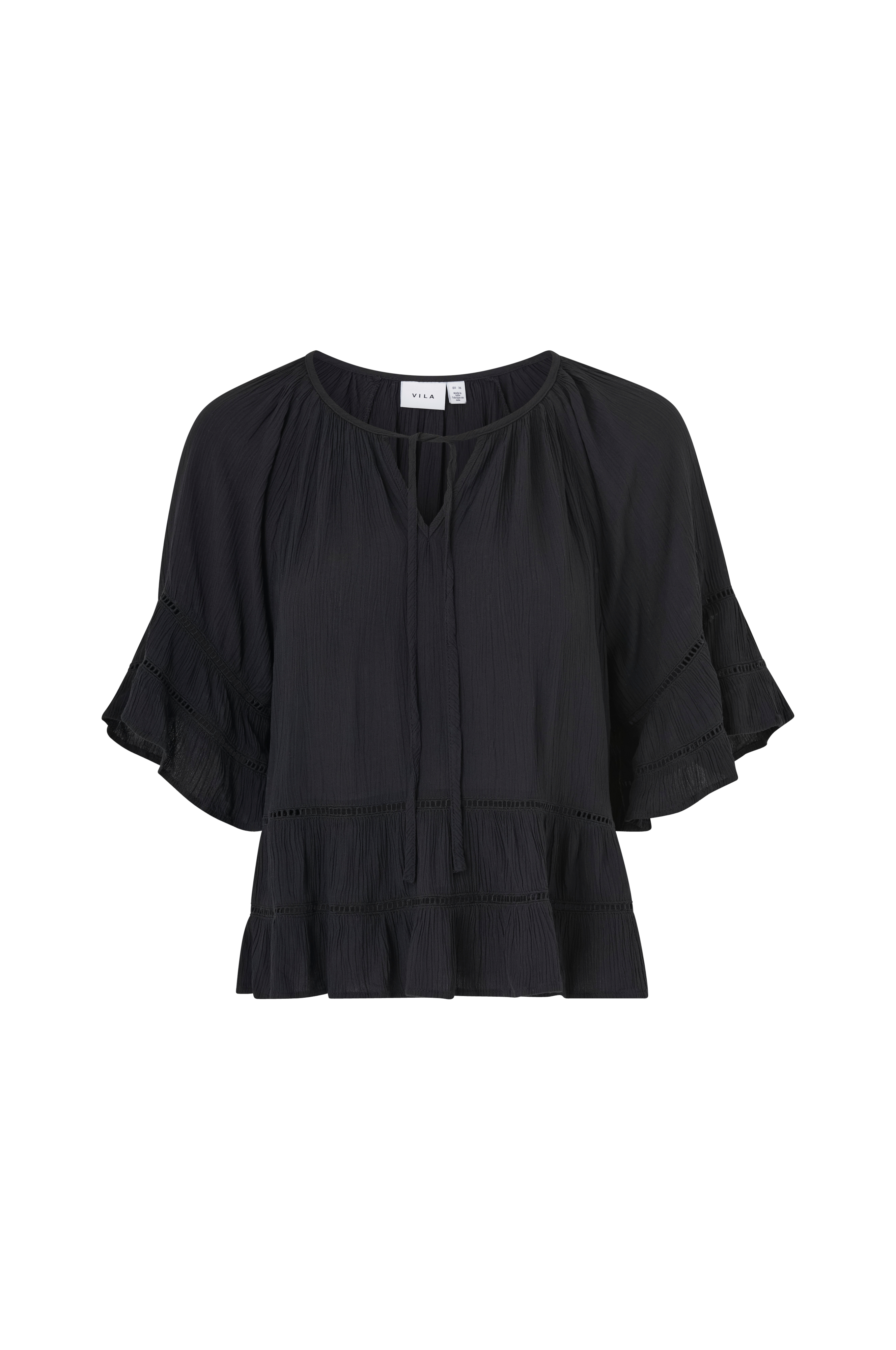 • Model i crepe• Peplumdesign med indlagt blonde• Rund hals med samling og bindebånd• Kort ærme med svaj
