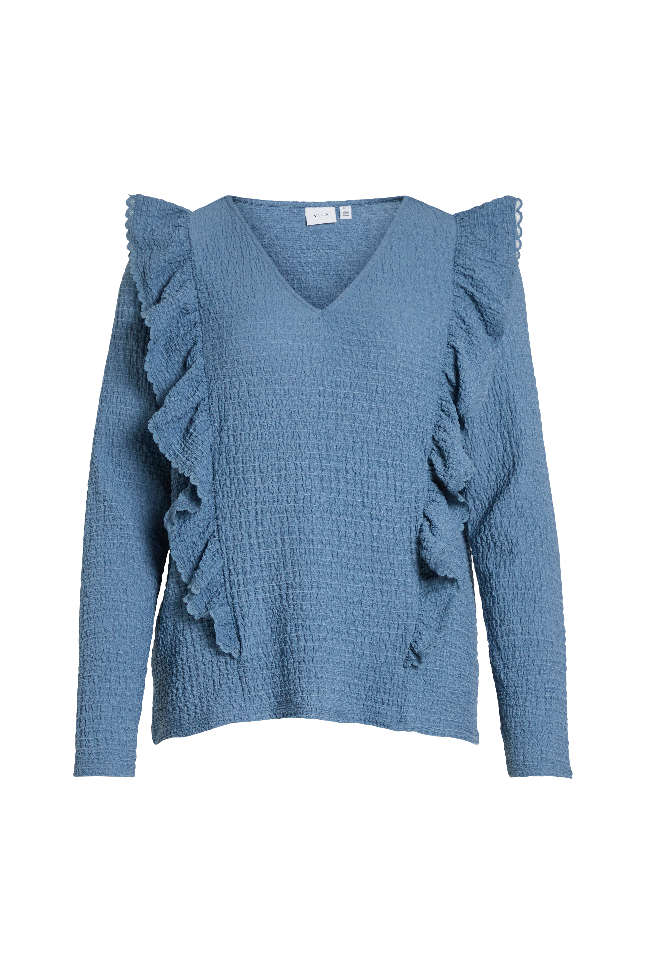 • V-udskæring• Volant over skuldrene• Strækstof med struktur