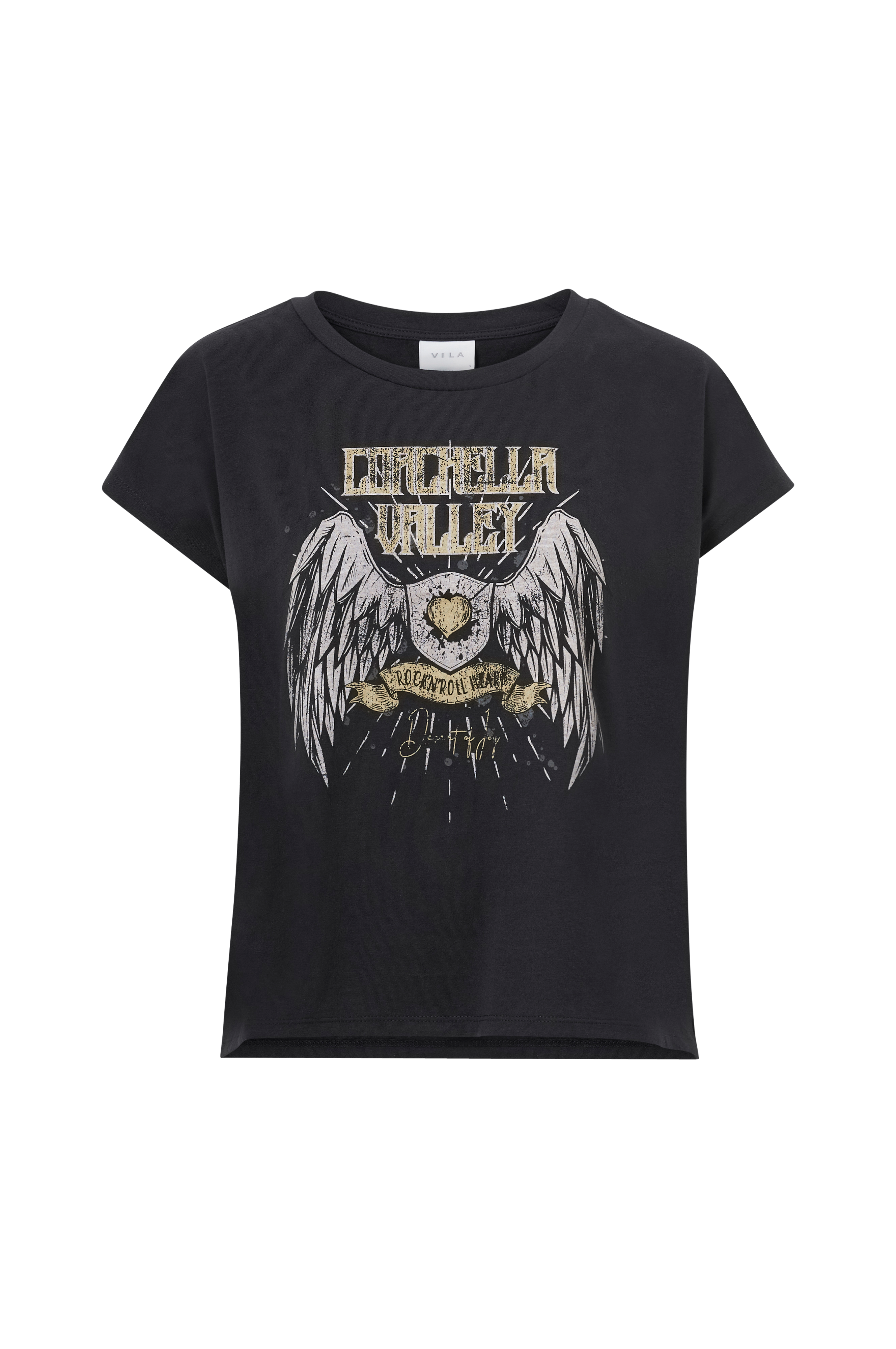 Kortærmet top med tryk foran. Rund, ribbet halsudskæring. Ventilation langs siderne.