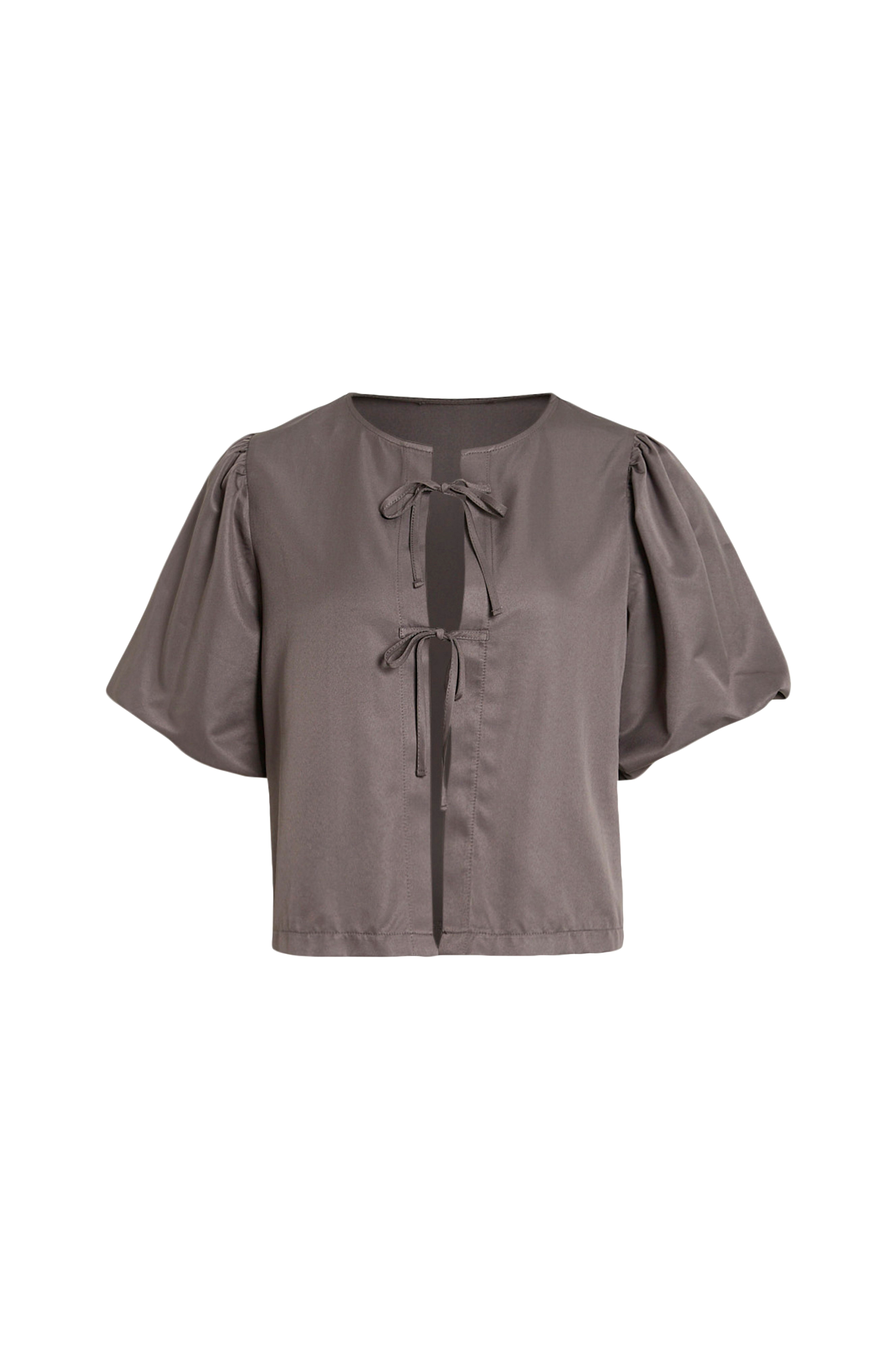 • Top i glinsende materiale med afrundet halsudskæring• Korte ballonærmer• Åbning foran med to bindebånd• Firkantet pasform