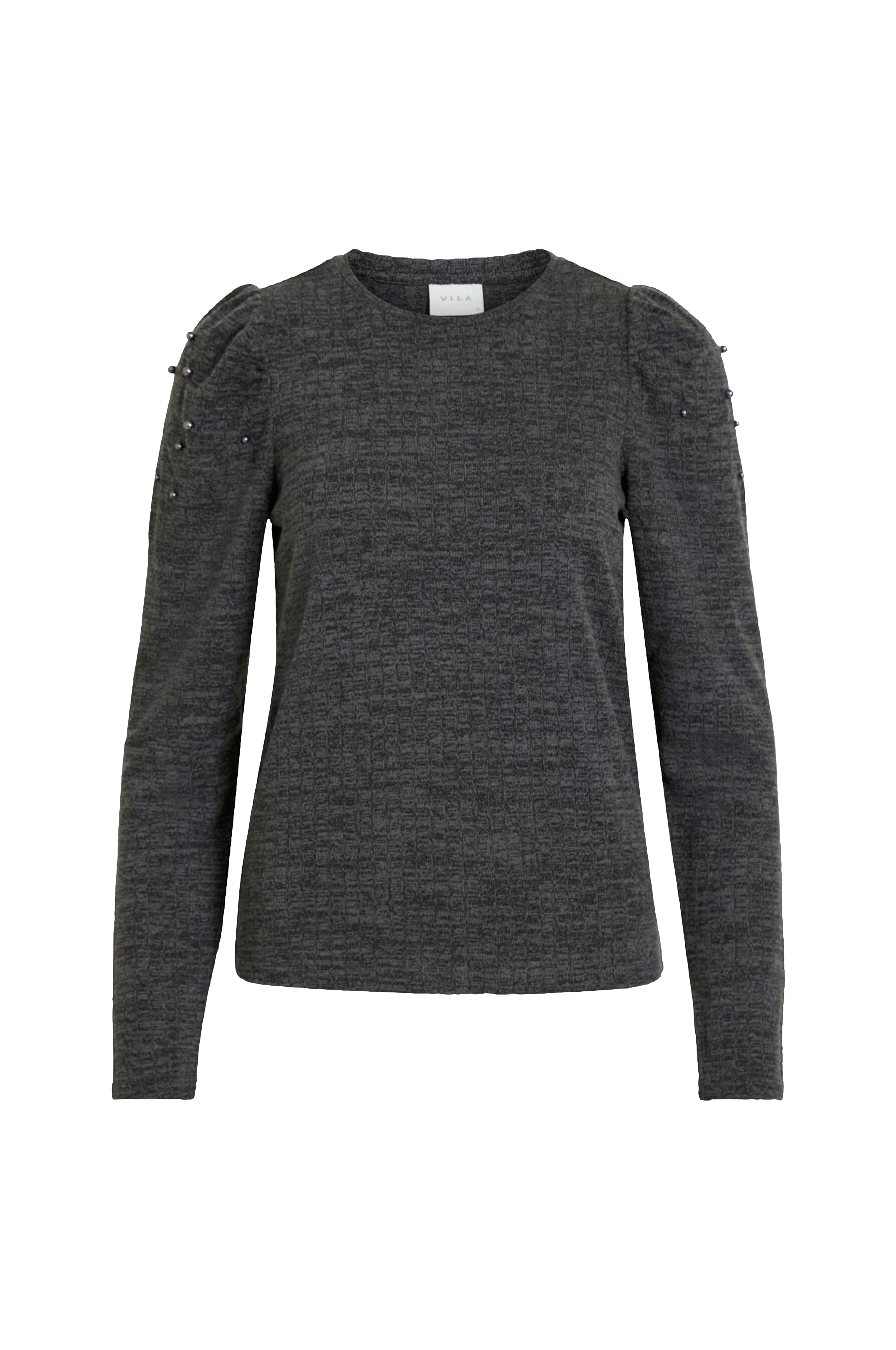 Top viSunji Pearl L/S Top fra Vila. Finstrikket top i meleret kvalitet med smalle, indvævede striber. Pufærme med rynkning ved skulderen og broderede perler foroven.