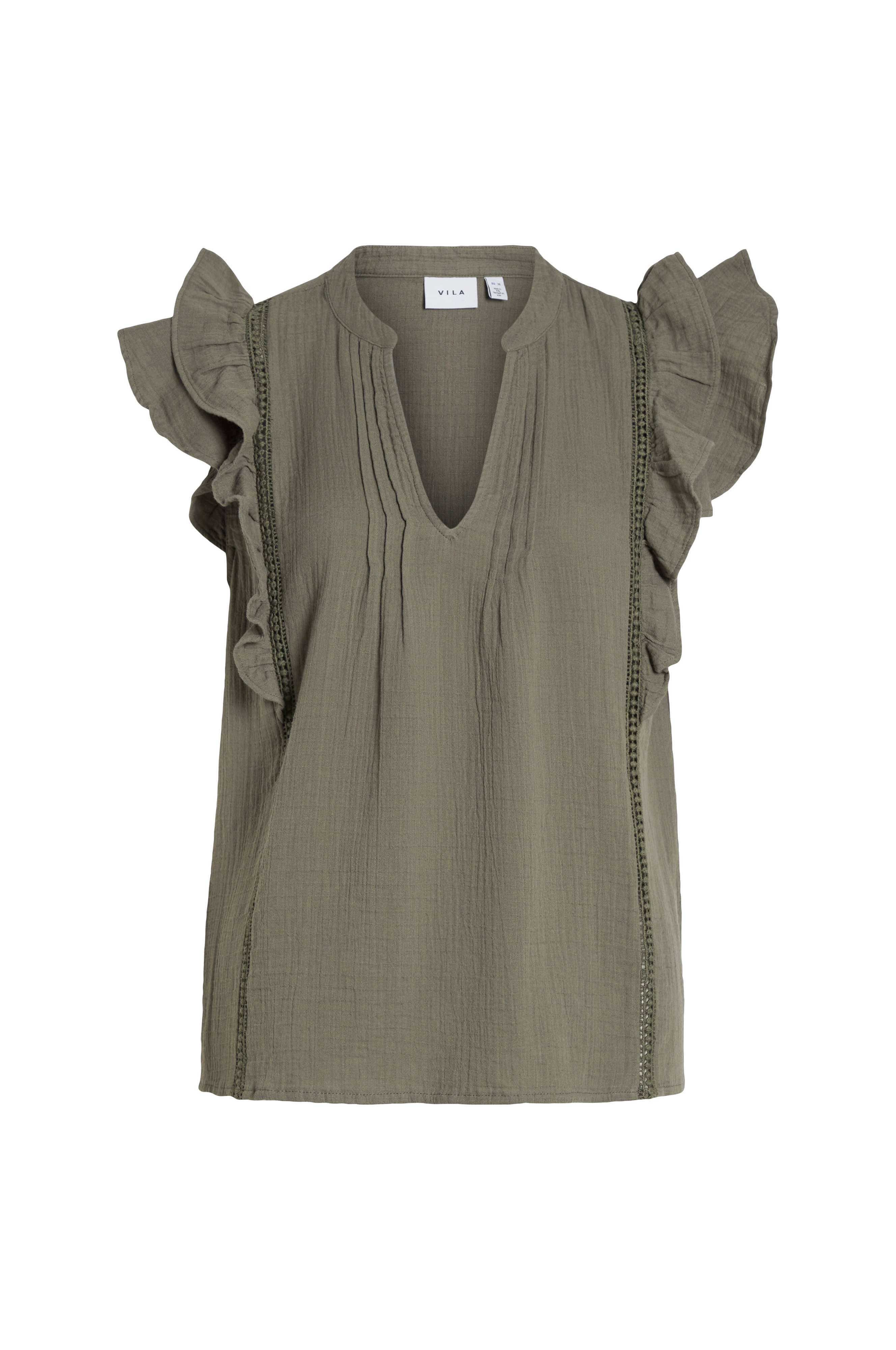 • Lige model i crepe• V-udskæring med syede biselæg på brystet• Vertikal, smal blonde foran og bagpå• Kort flagrende ærme