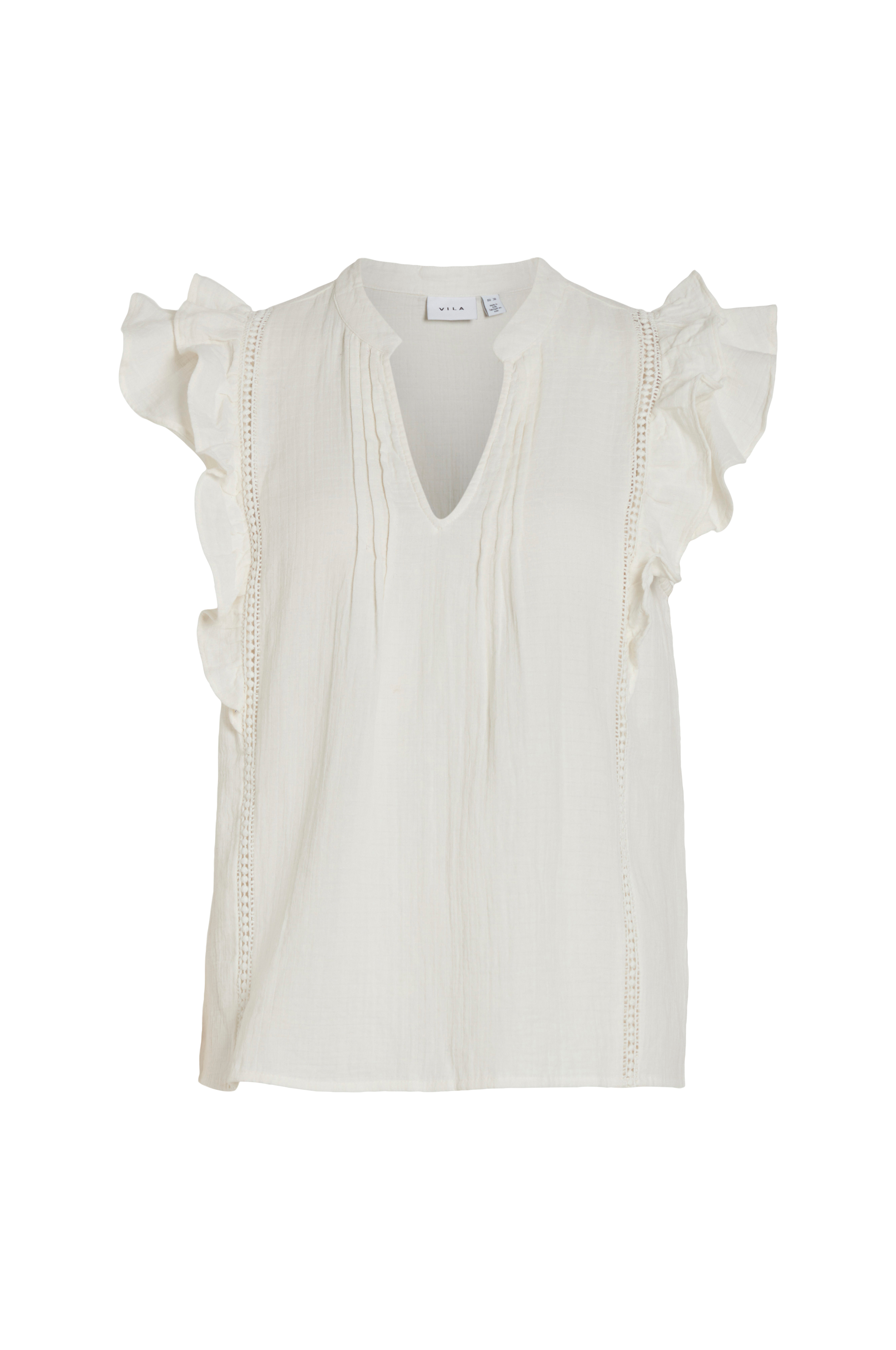 • Lige model i crepe• V-udskæring med syede biselæg på brystet• Vertikal, smal blonde foran og bagpå• Kort flagrende ærme