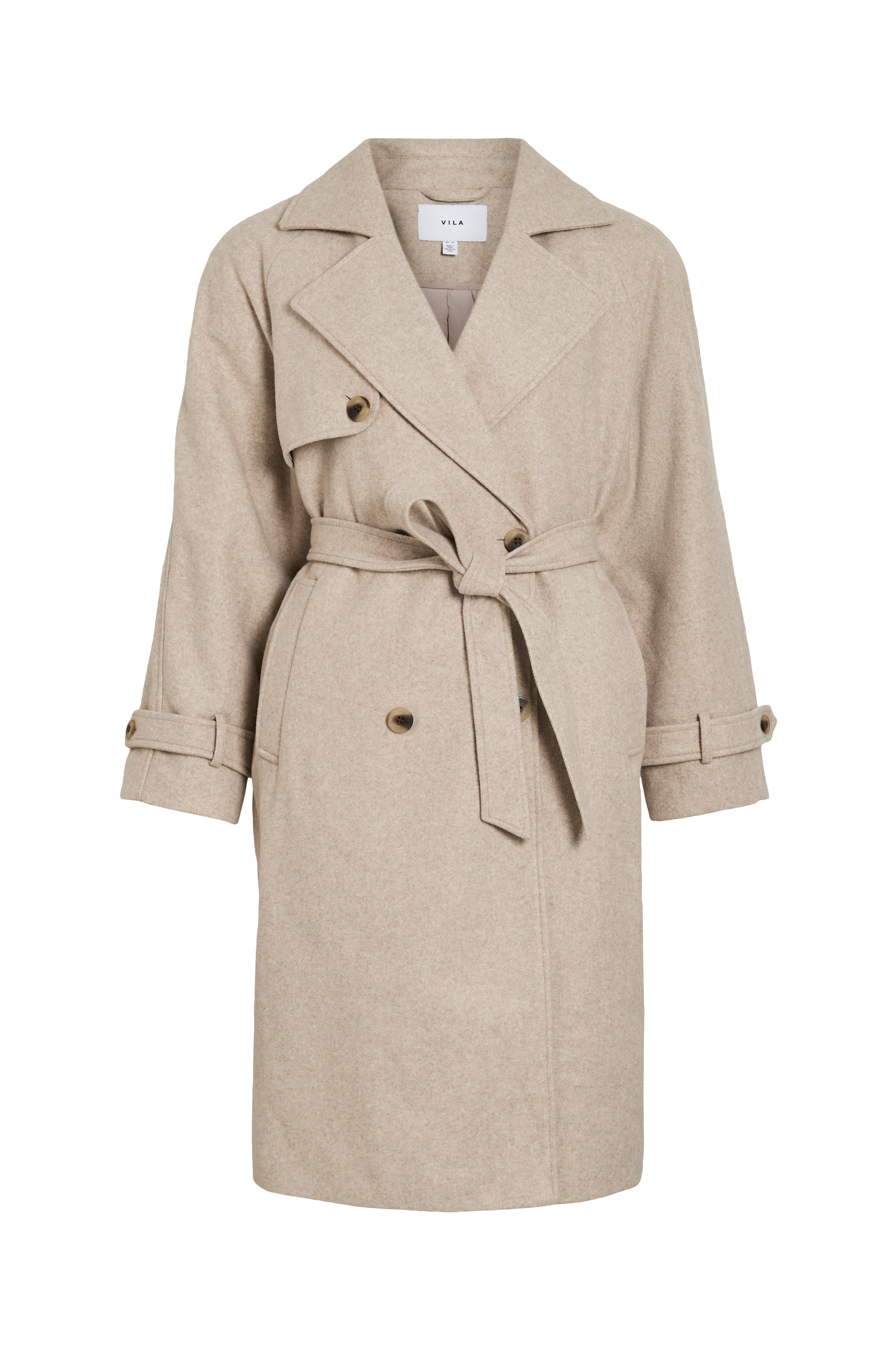• Frakke med dobbelt knaplukning• Krave med revers• Stropper ved ærmeafslutningerne• Bindebælte ved taljen• Quiltet, let foret tekstilforing• Sidelommer• Slids nede bagved• Længde: 107 cm i størrelse 36