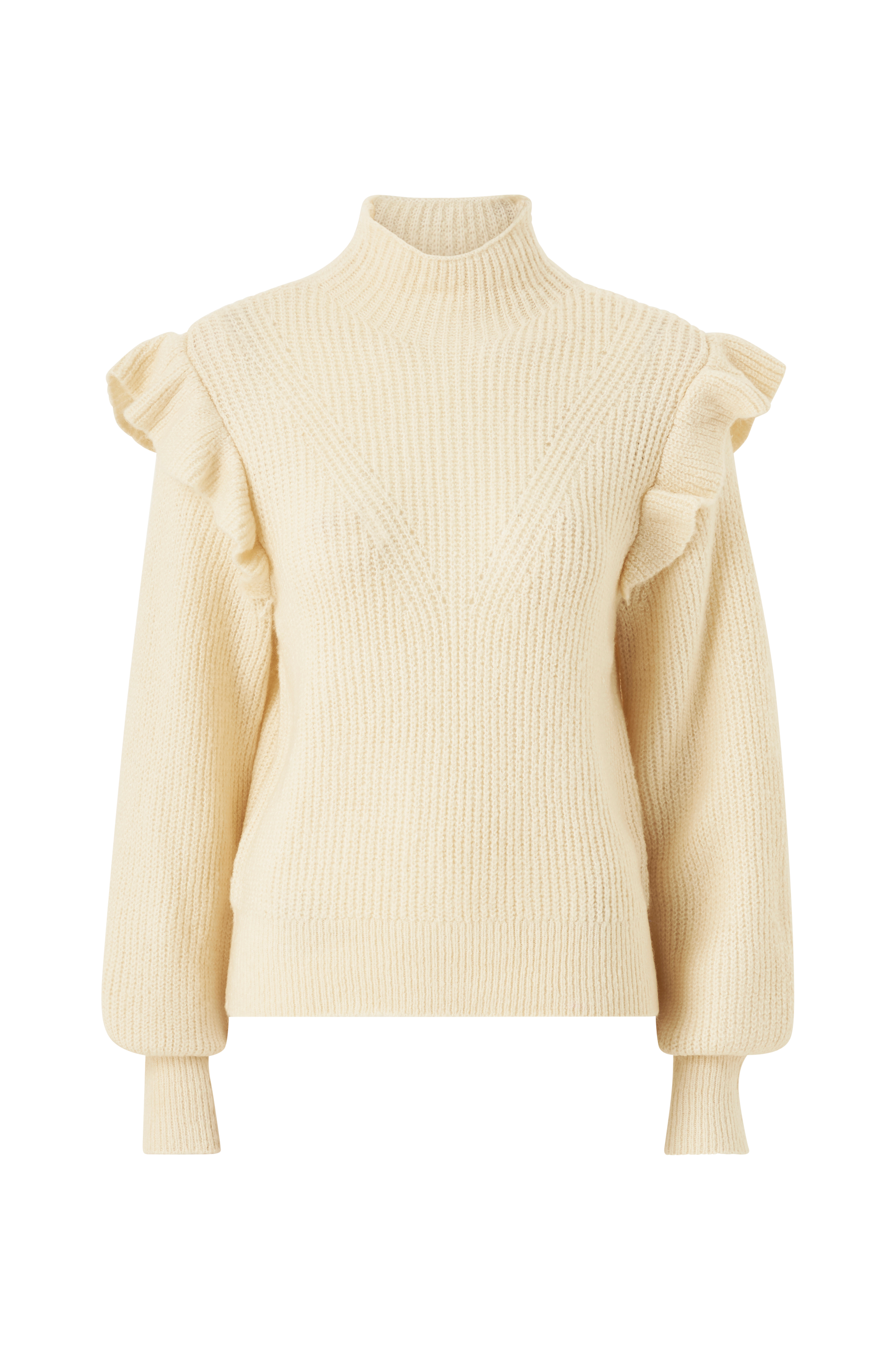 • Blød, strikket kvalitet• Volanter på skuldrene• Ballonærmer med ribstrikket manchet• Opretstående krave