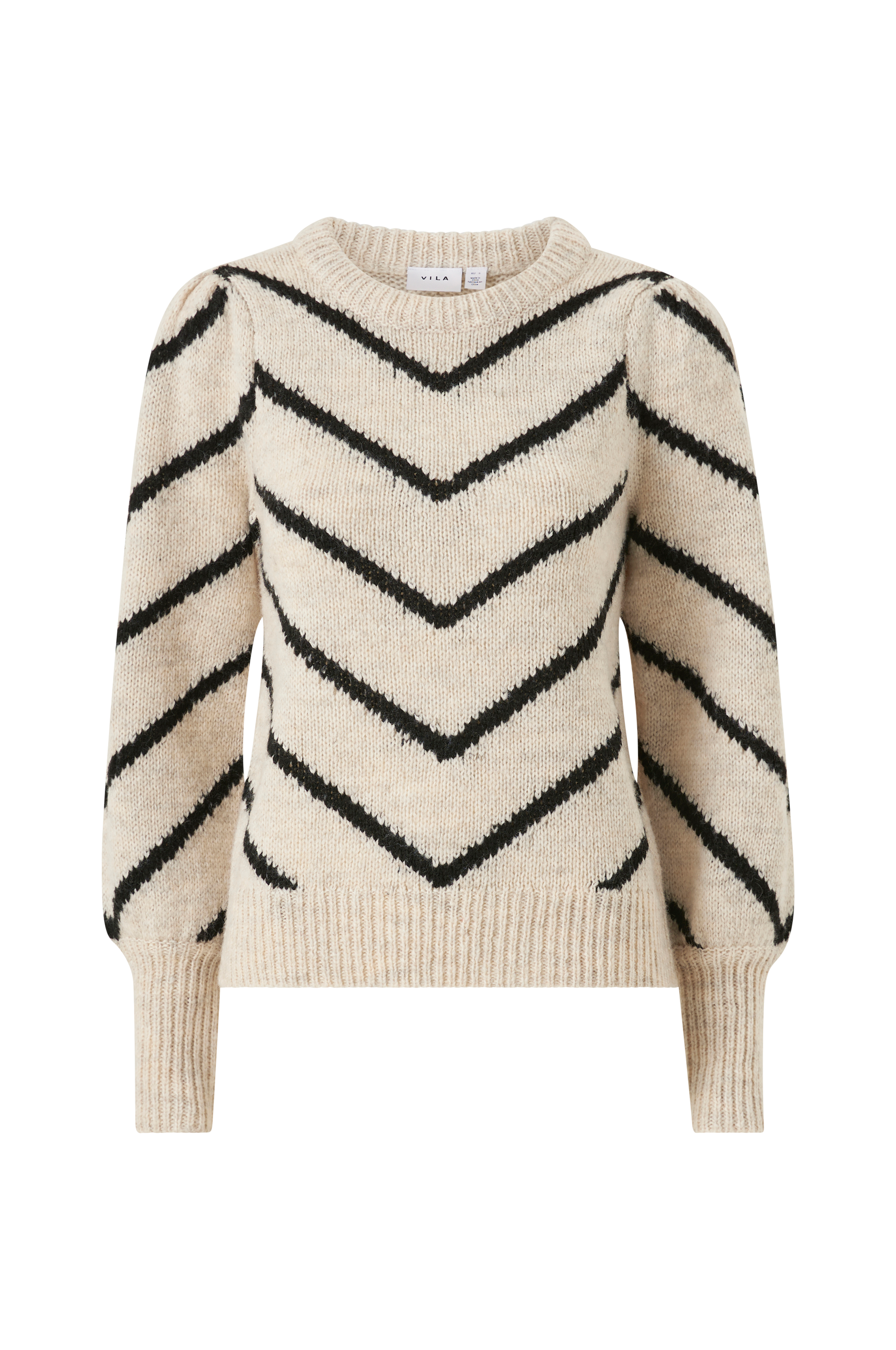 • Lige model med strikkede striber• Rund hals med ribkant• Ballonærme med bred ribmanchet• Ribstrik ved nederste kant