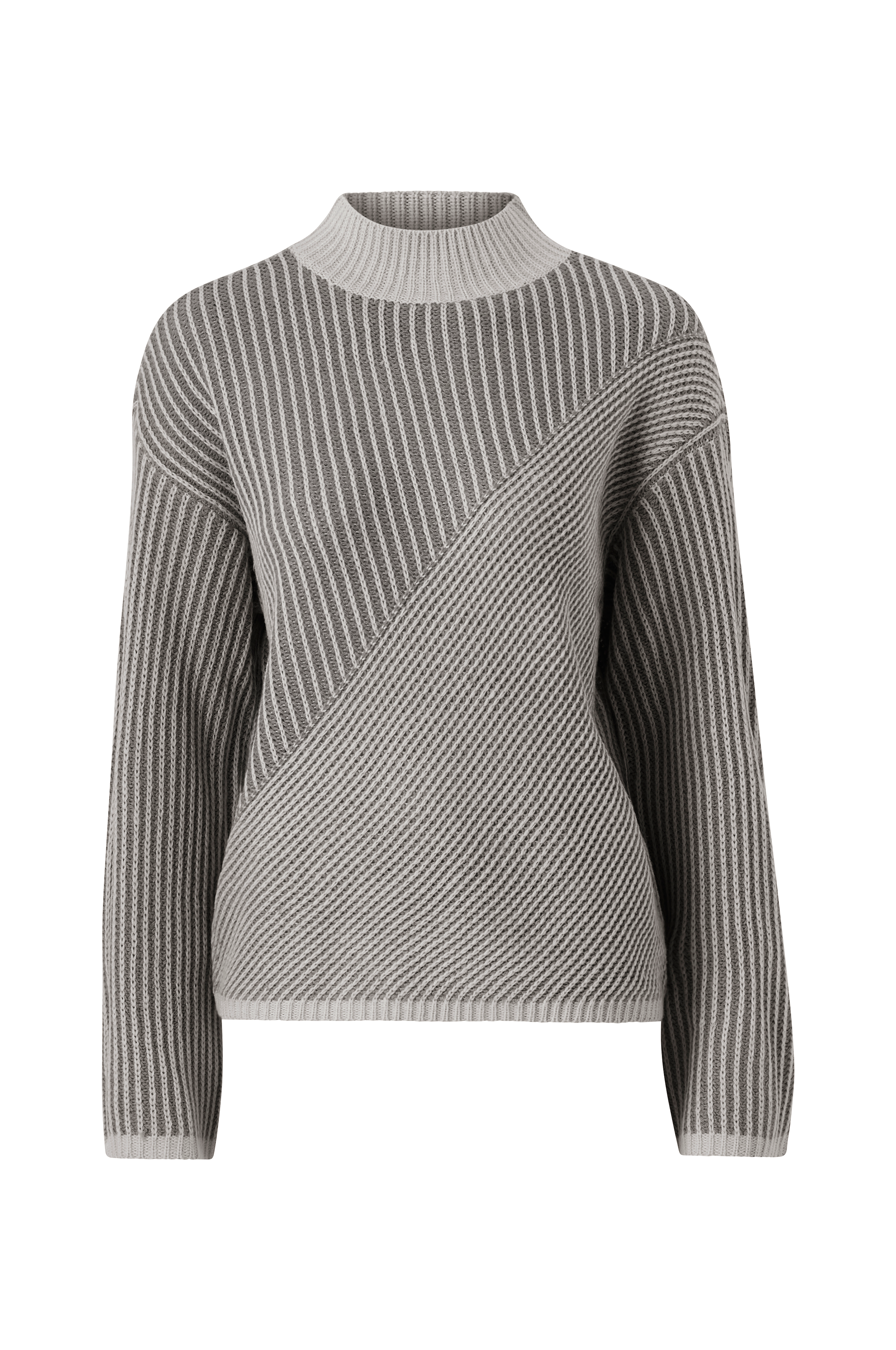 • Stribet model• Ribstrikket krave• Nedsænket skulder med langt, lige ærme• Smal ribstrik ved manchetterne og ved nederste kant