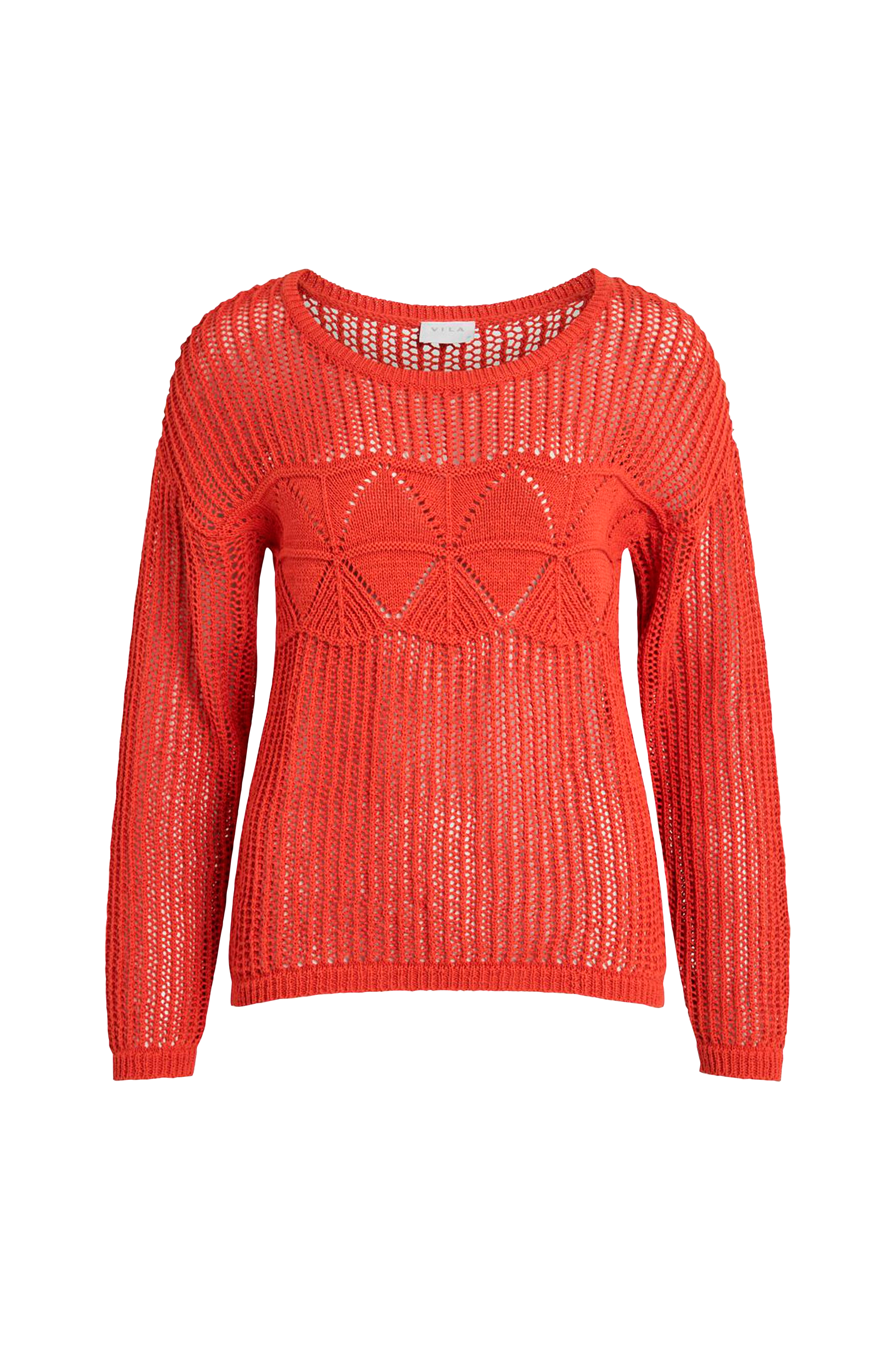 Trøje i tyndt strikket model med mønsterstrik rundt om brystet. Rund hals med lille ribkant samt ribkant i kant forneden og ærmekant.