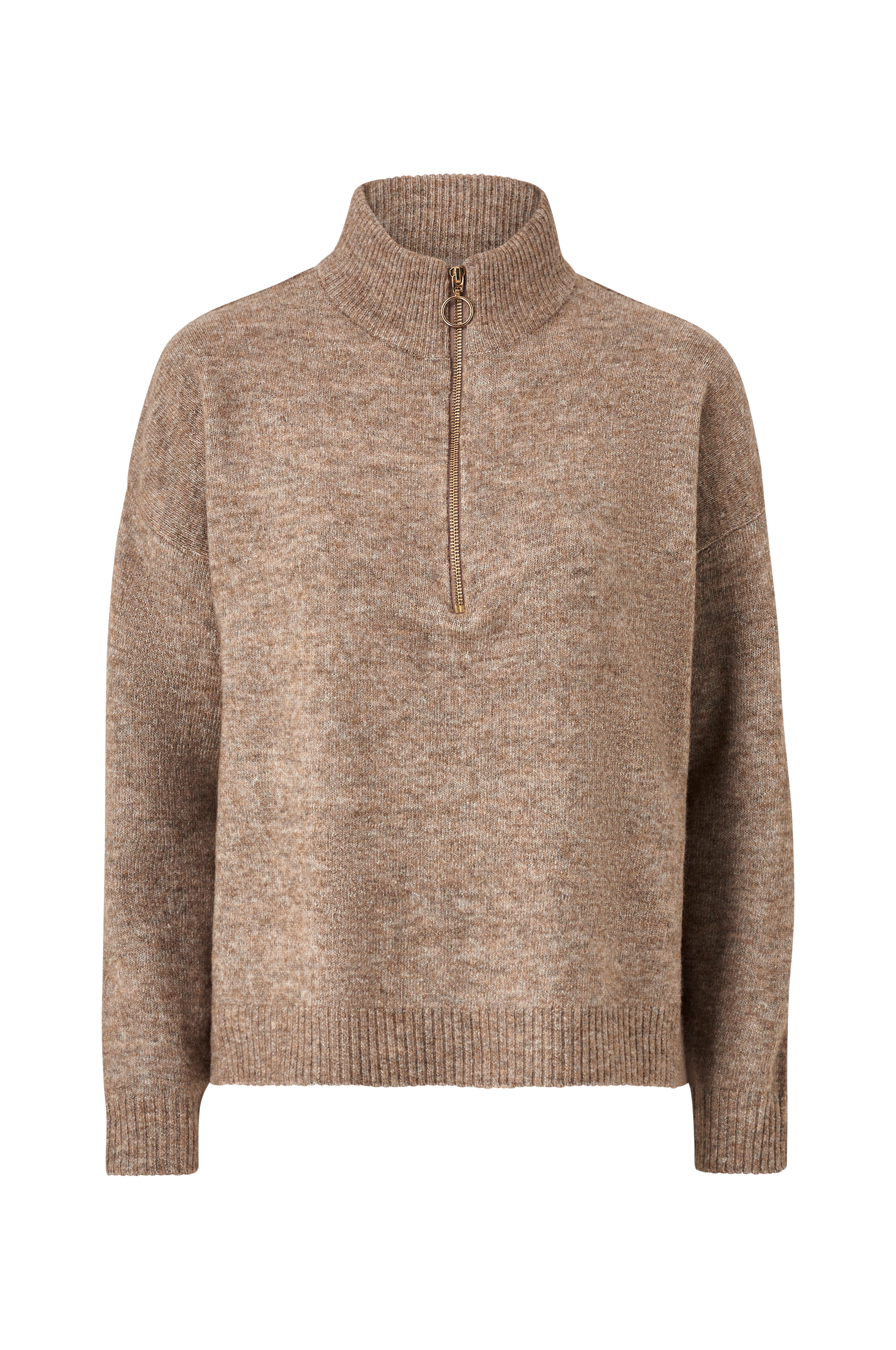 • Strikket trøje• Ribstrikket ståkrave med lynlås• Nedsænkede skuldre• Firkantet pasform• Produktet indeholder genindvundet materiale, som genbruges for at reducere mængden af affald samtidigt med at der ikke anvendes nye ressourcer.