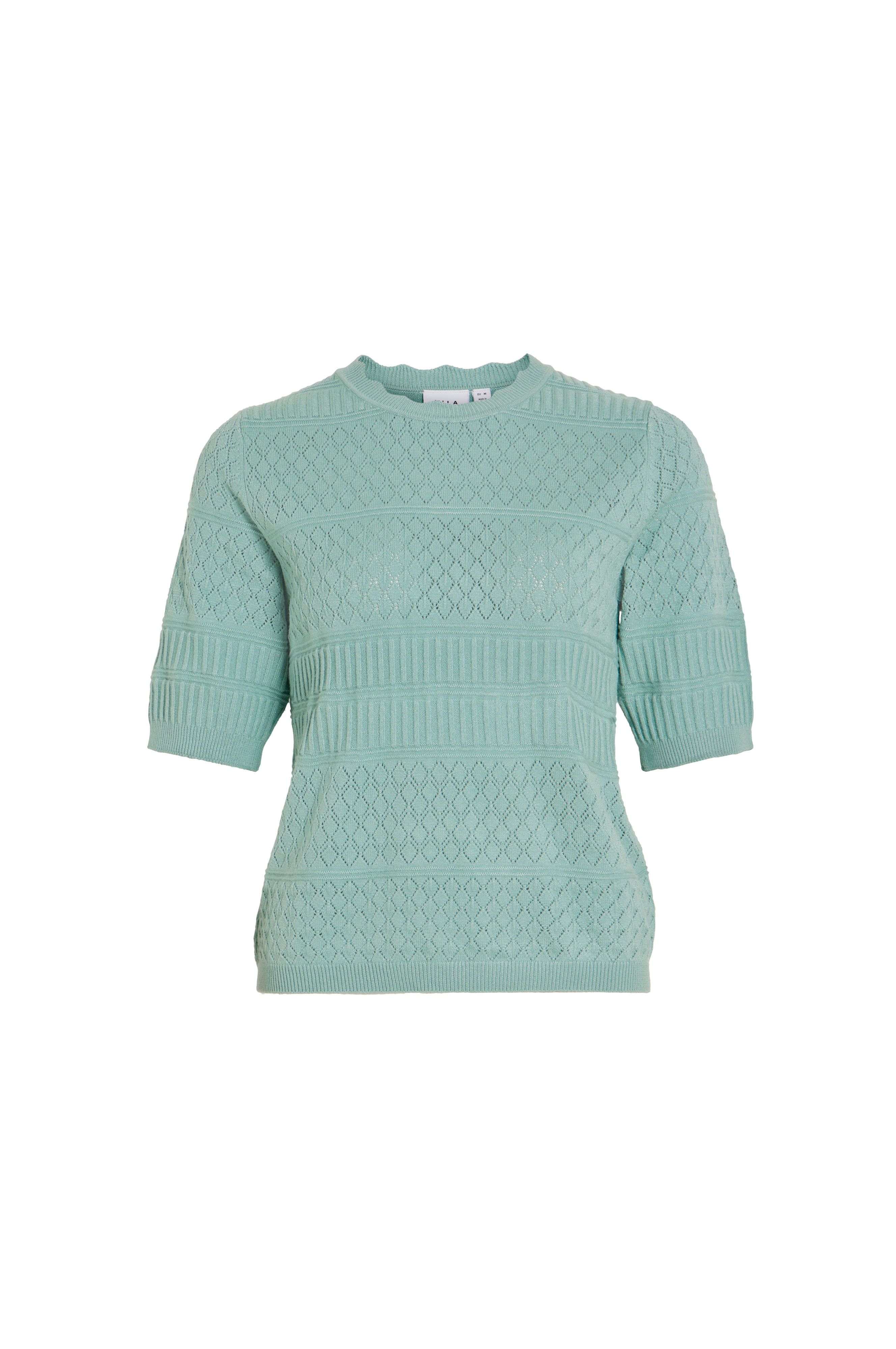 • Blød, fintstrikket trøje• Hulmønstrede detaljer• Rund halsudskæring med bølget kant• Korte ærmer