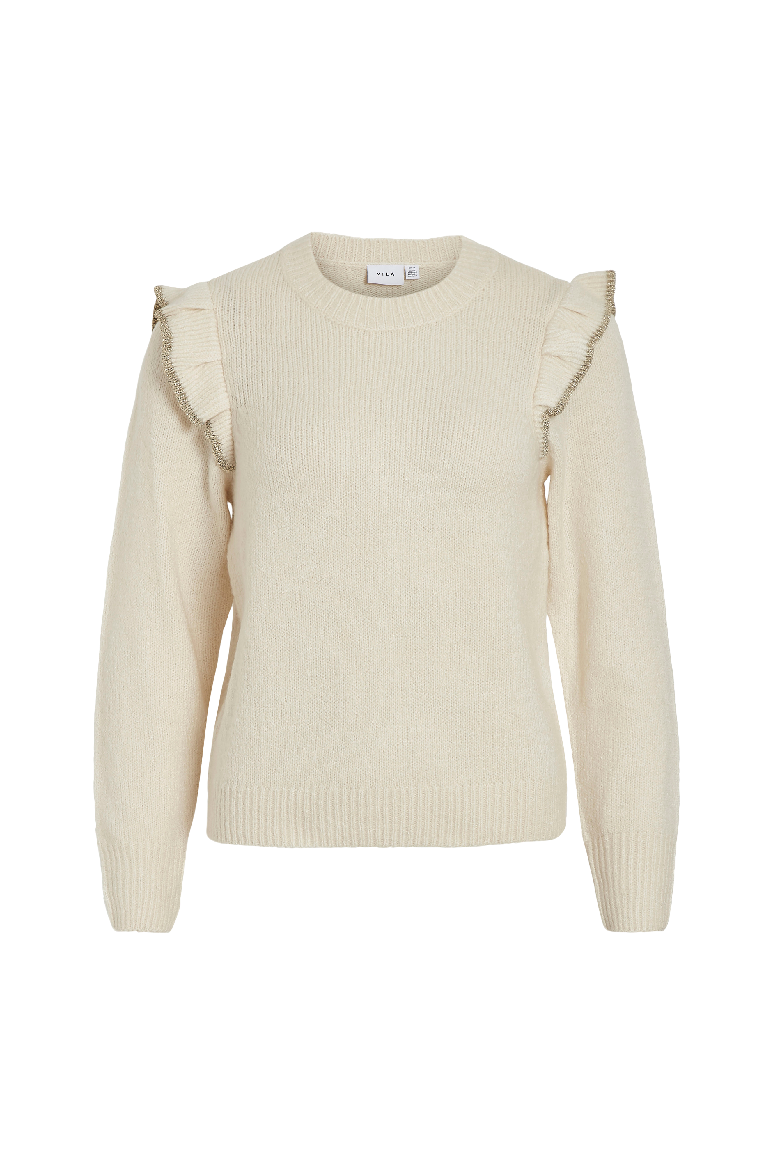 • Fintstrikket, langærmet trøje med glitrende volantdetalje• Afrundet, ribstrikket halsudskæring• Ribstrik ved manchetterne og nederst