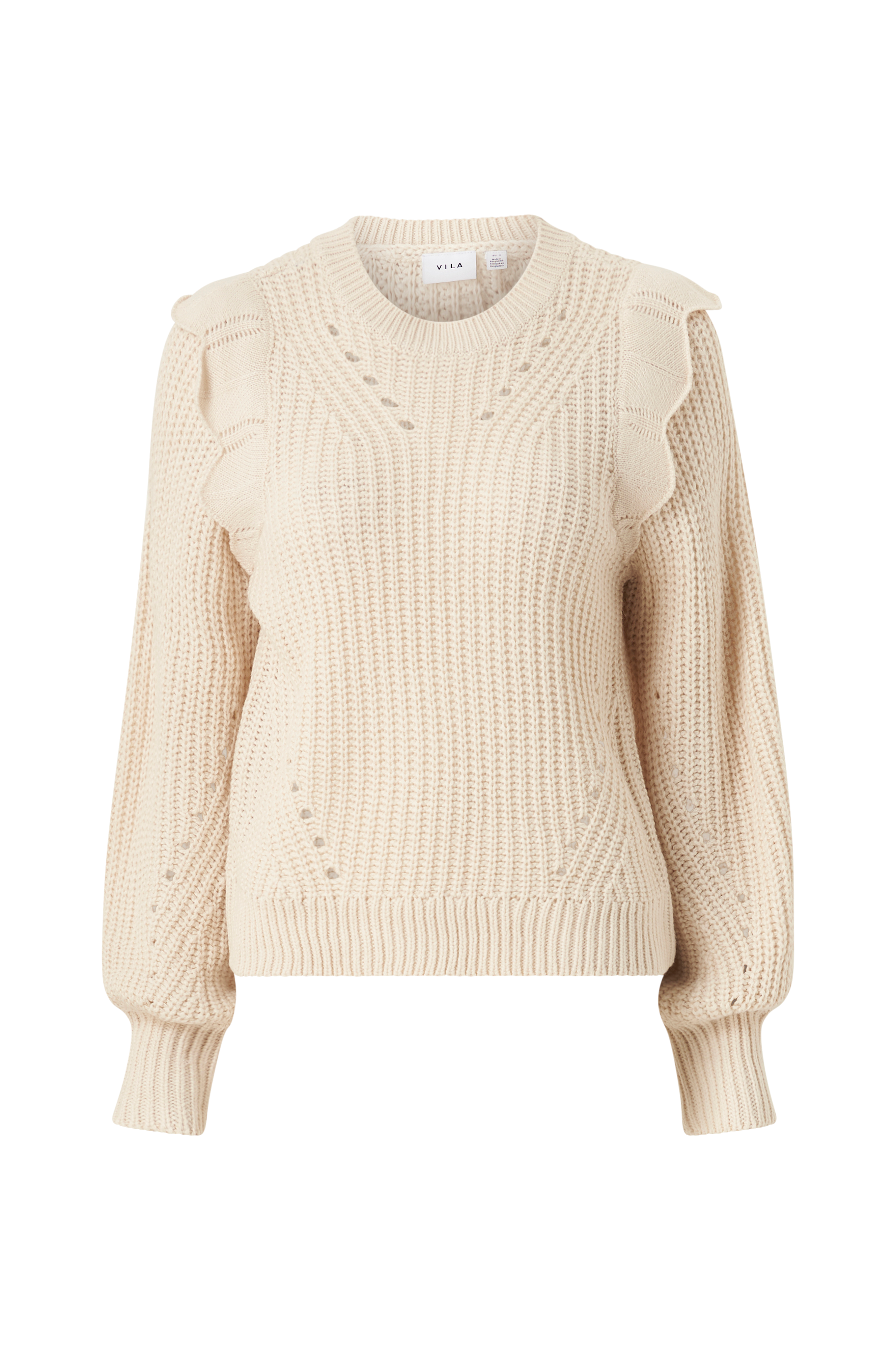 • Strukturstrikket trøje• Volanter på skuldrene• Ribstrikket manchet ved manchetterne