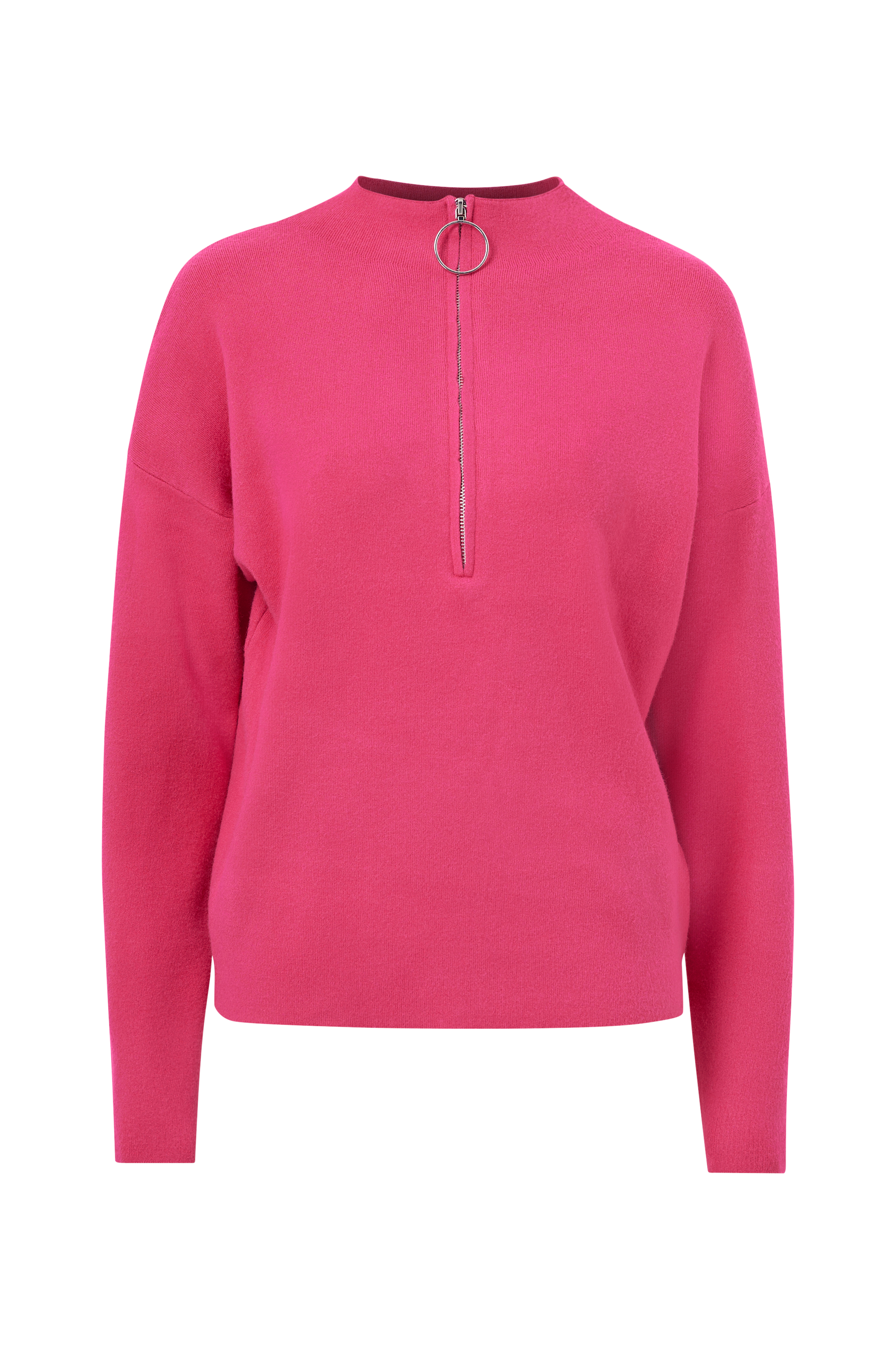 Glatstrikket oversizemodel med lav skulder og langt ærme. Halvhøj krave med lynlås foran som har stor ring.