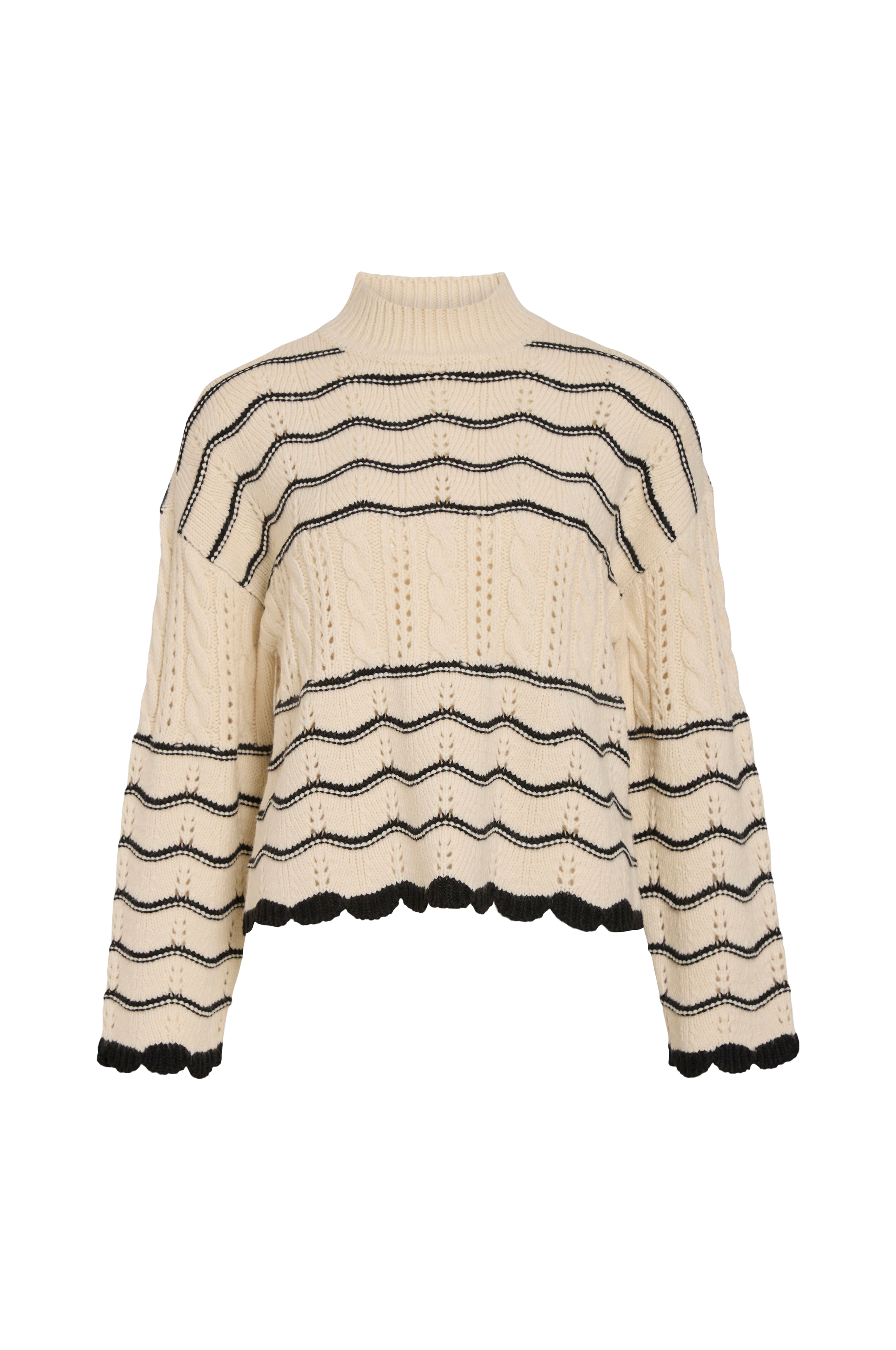 • Lige, mønsterstrikket model• Høj, ribstrikket krave• Nedsænket skulder• Lige ærme• Bølgede sømme