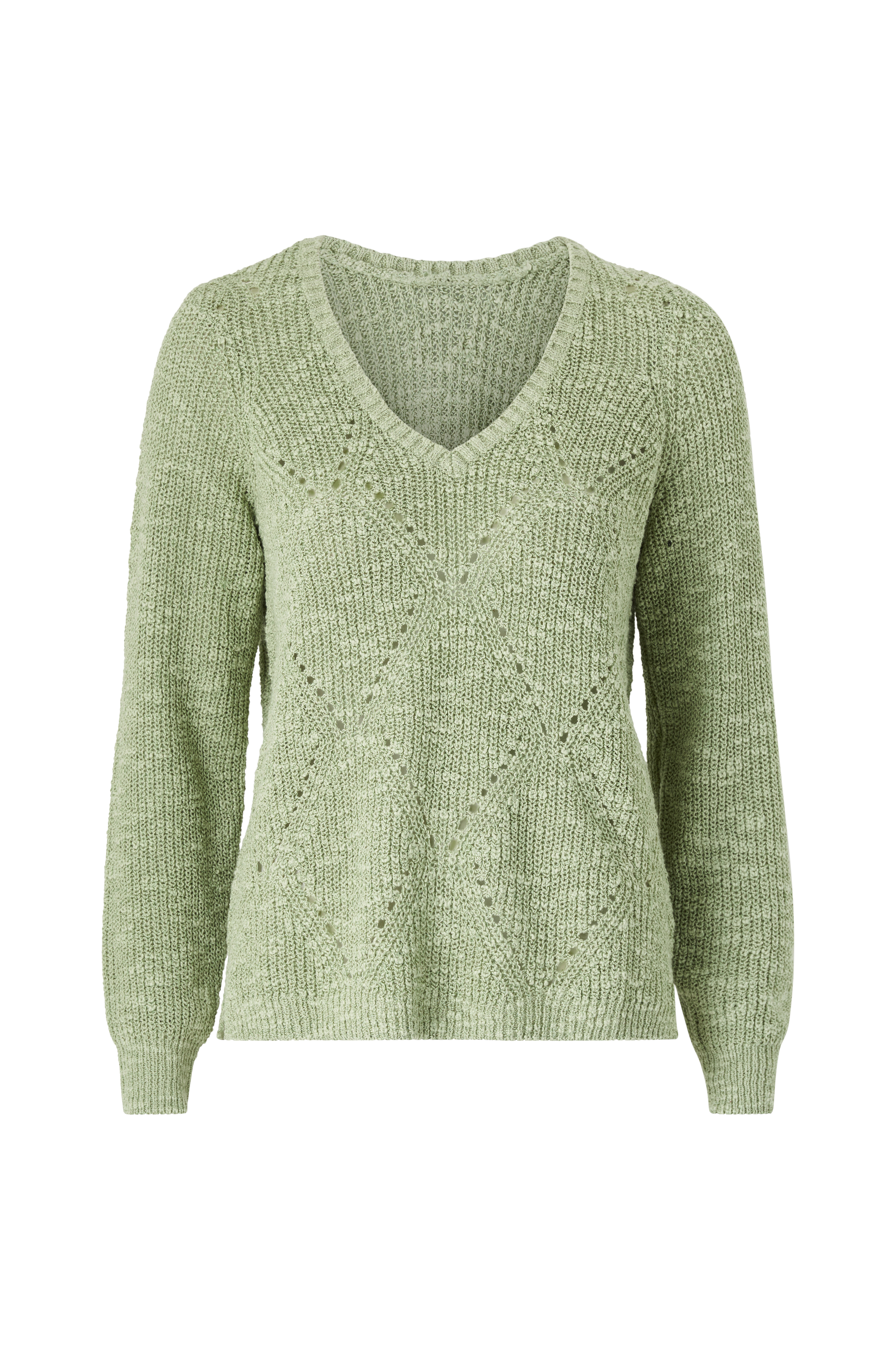 • Strikket trøje med hulmønster foran• Glitrende effekt• V-formet halsudskæring• Ribstrik ved manchetterne og ved nederste kant