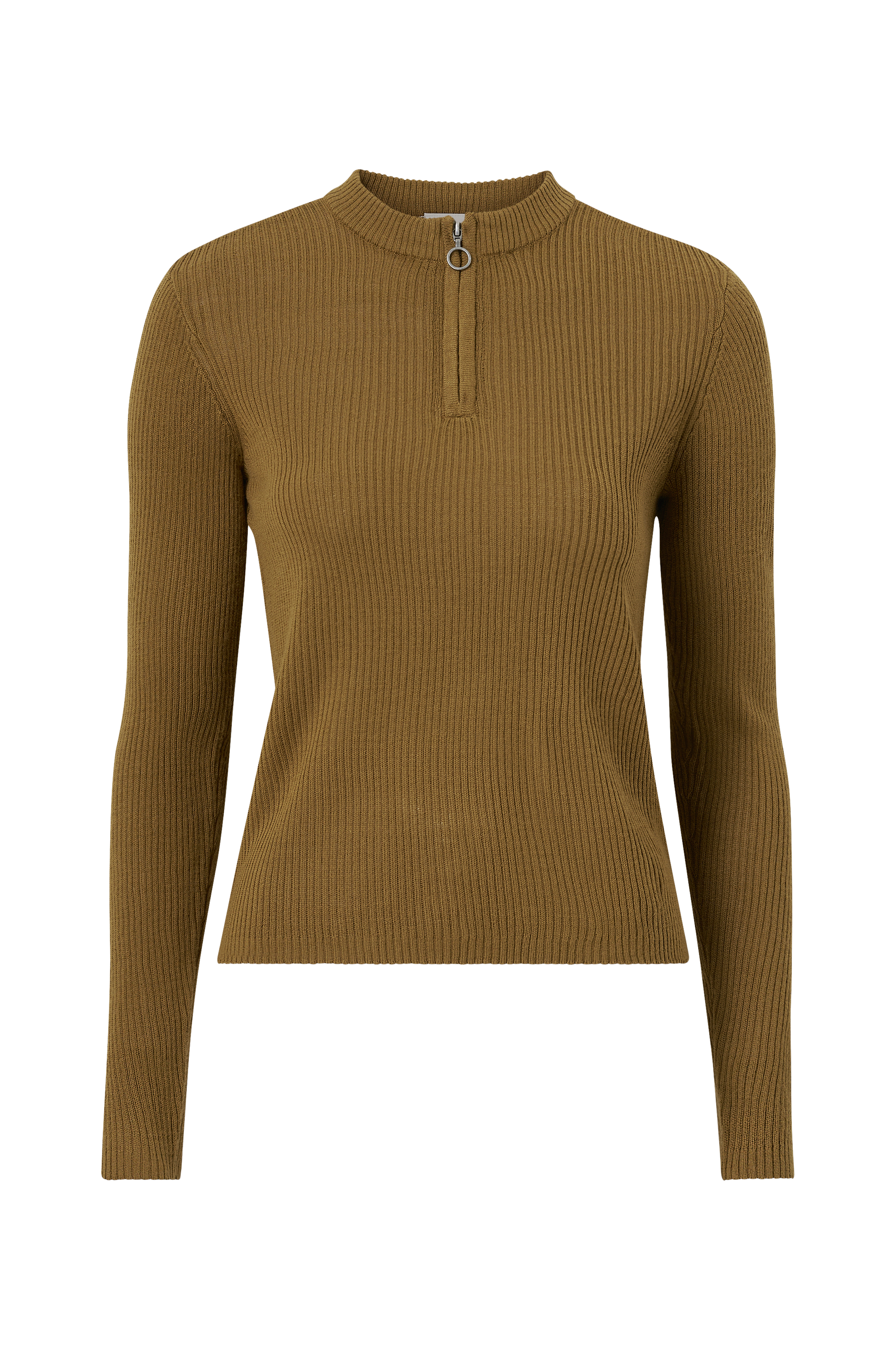 Ribstrikket trøje med kort lynlås foran. Lige pasform og lange ærmer.