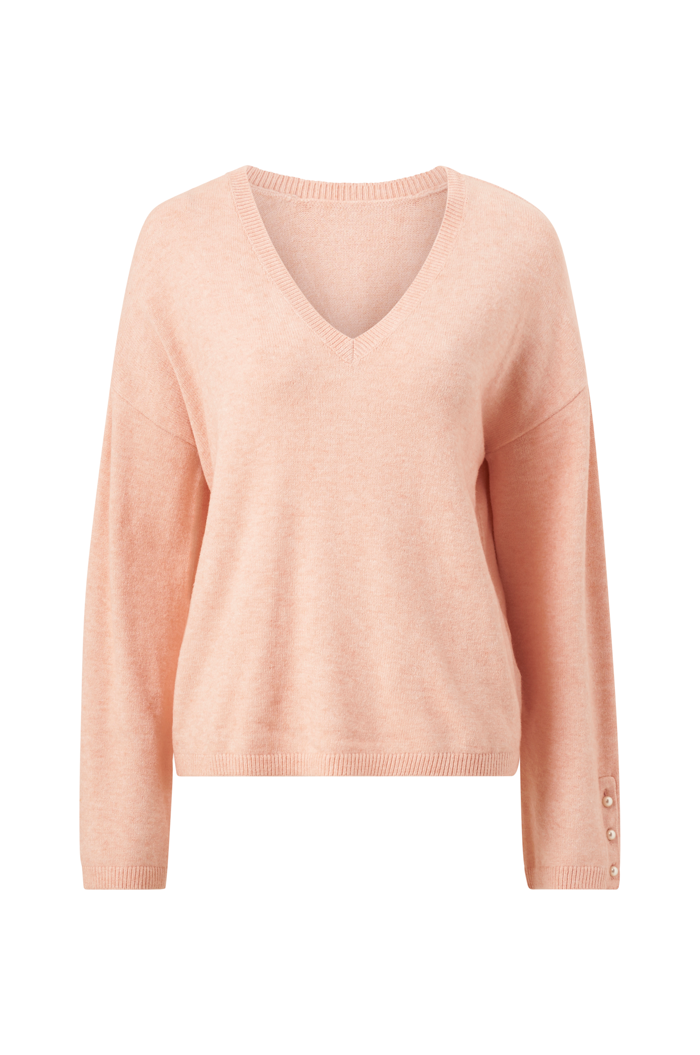 • V-udskæring• Nedsænkede skuldre• Perleknaper ved ærmeafslutningerne• Blød, strikket kvalitet