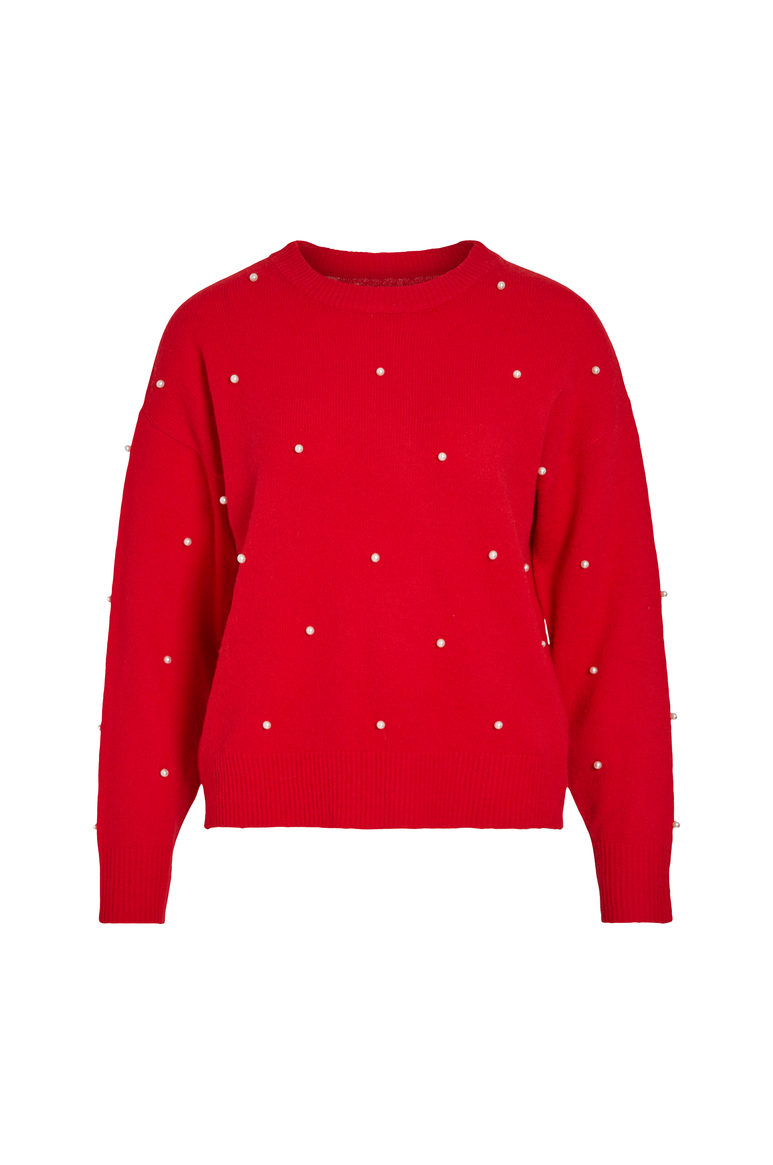 • Glatstrikket model med broderede perler• Halvhøj, ribstrikket krave• Nedsænket skulder med langt ærme• Ribstrik nederst og ved manchetterne