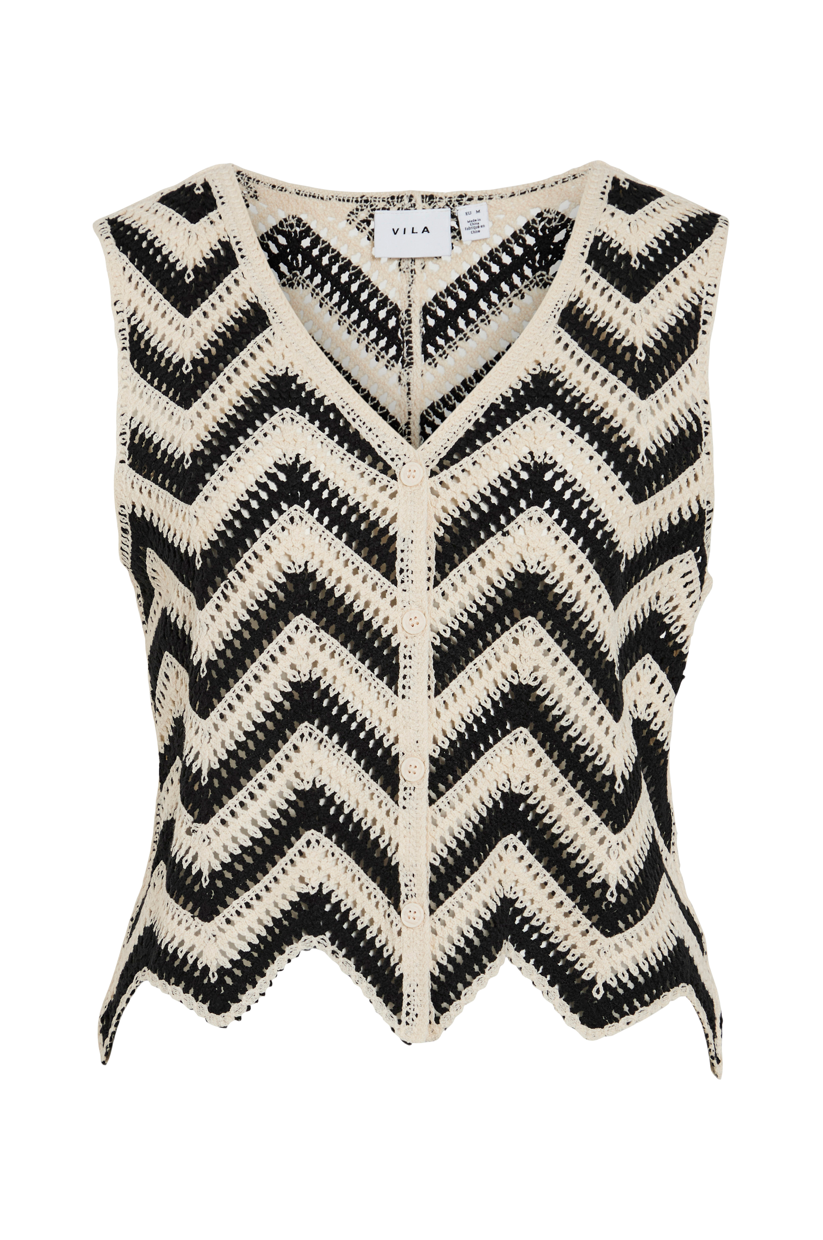 • Strikket vest med hulmønster• V-formet halsudskæring• Åbning med knapper foran• Bølget kant nederst