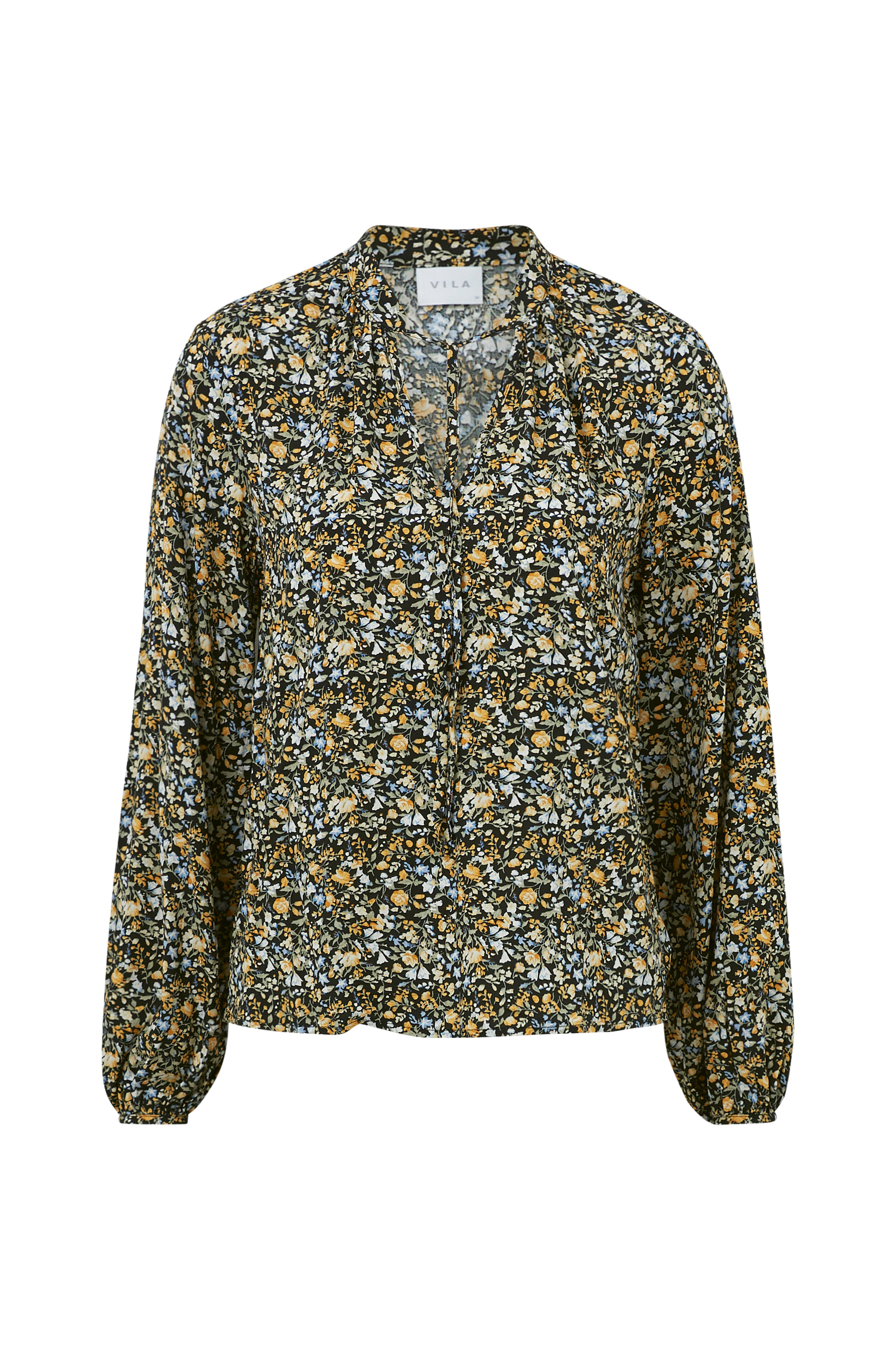 viTendi Tullam L/S Top. Bluse i lige model med rund hals som har påsyet kant med rynkning og V-udskæring foran med smalt bindebånd. Langt, ekstra vidt ærme med smal kant i ærmekant.