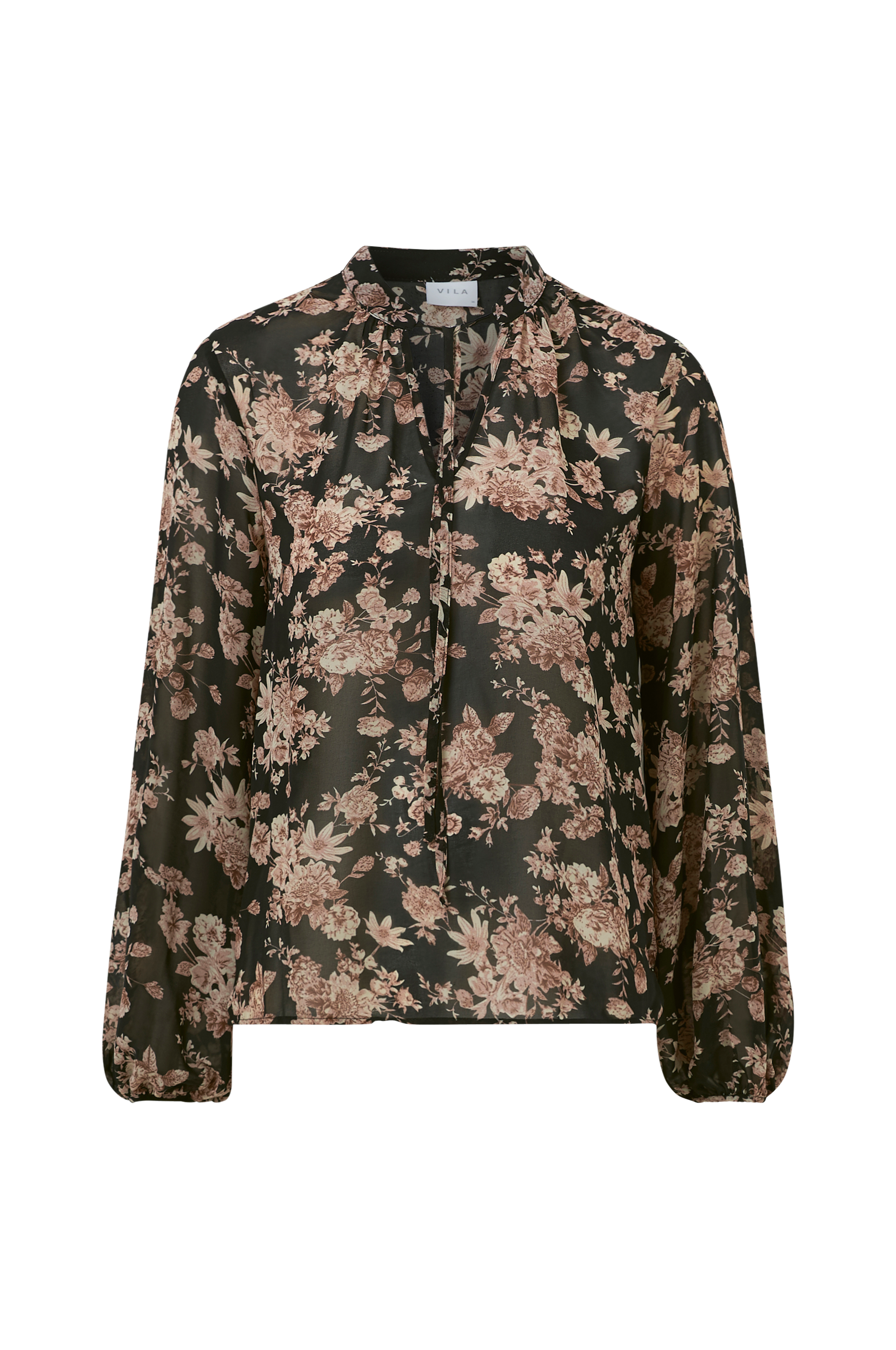 Bluse i mønstret chiffon med rund hals med påsyet kant og V-udskæring med bindebånd foran. Ekstra vidt, langt ærme med smal, påsyet kant i ærmekant.