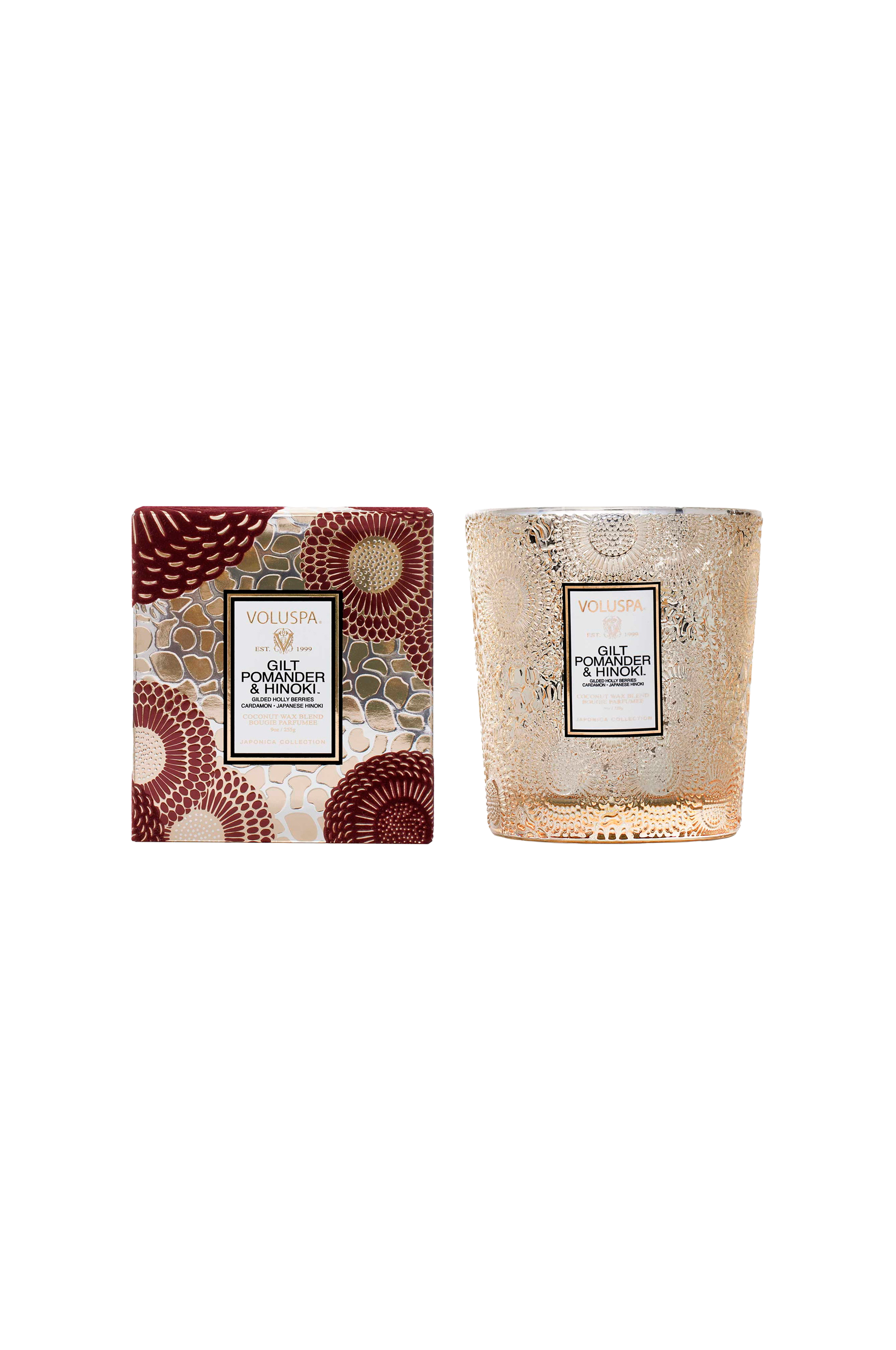 Noter af gylden krydret pomander, kristtornbær, kardemomme og japansk hinoki-bark.