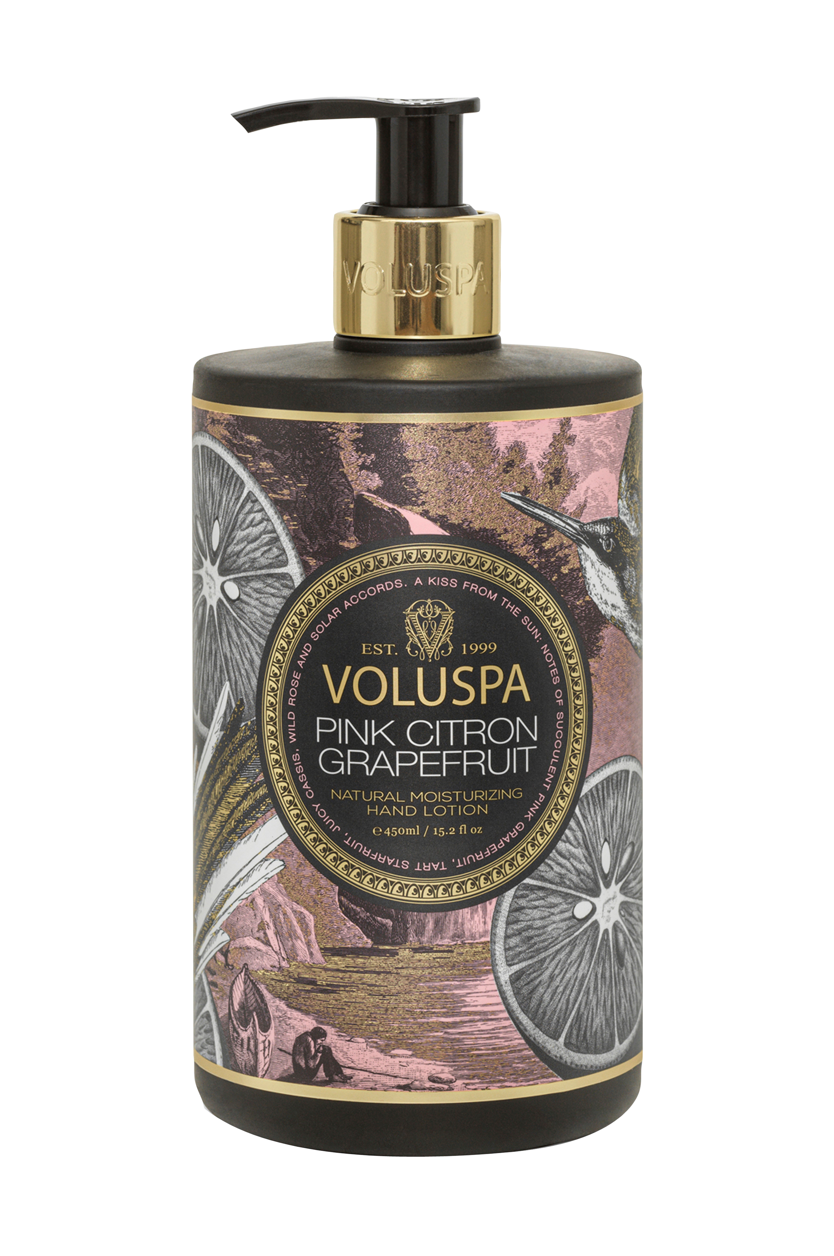 Håndlotion med duftende noter af stjernefrugt, saftig rød grapefrugt, solbær og vild rose. 450 ml.