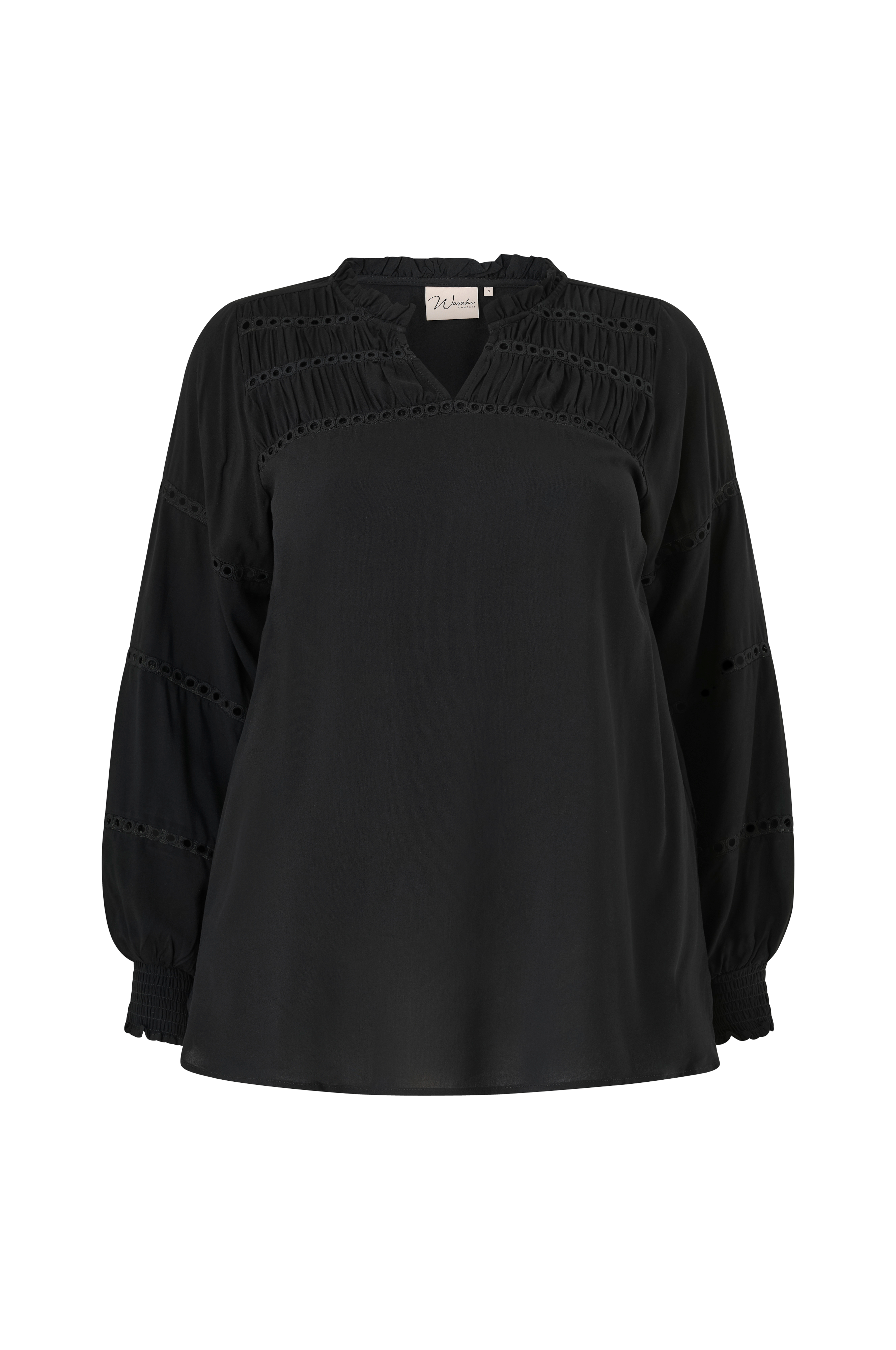 • Bluse med løs pasform og hulbroderier• Rund halsudskæring med flæsekant og slids• Lange ærmer med smock ved manchetterne• Slids nede i siderne• Plusstørrelser
