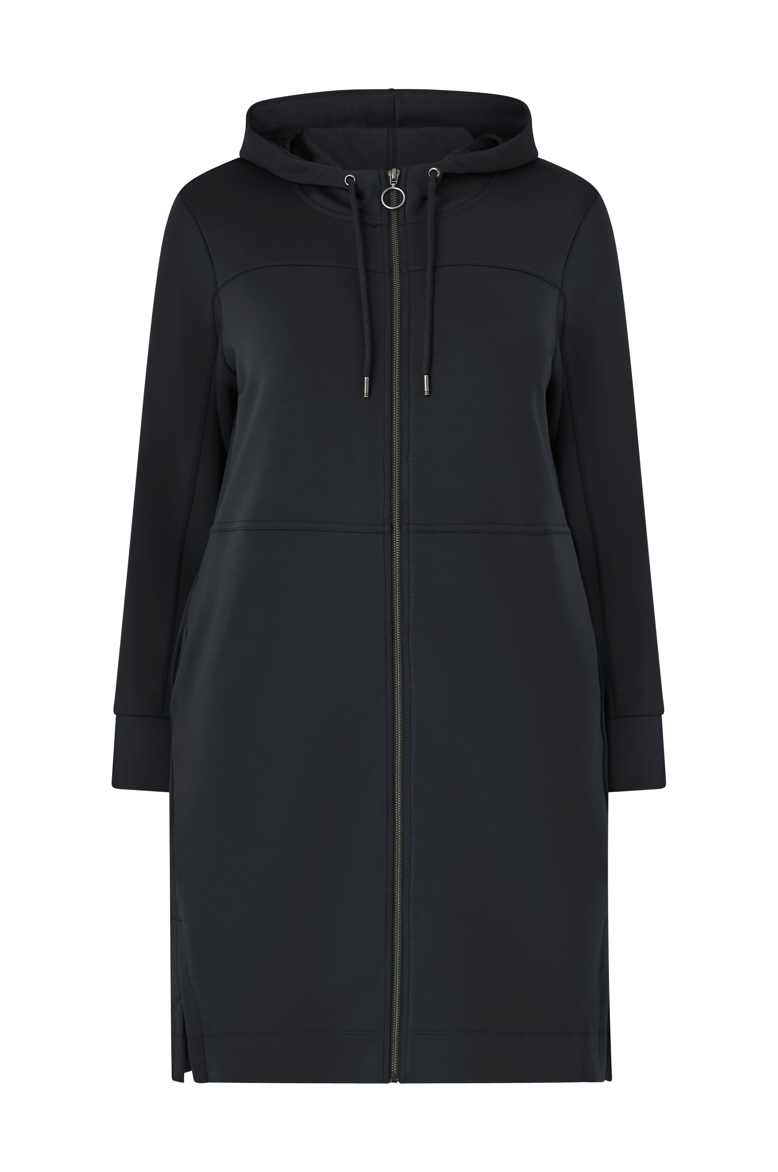• Blød, elastisk hættetrøje med lynlås foran• Lang model med slids nede i siderne• Træksnørre i hætten• Manchetter ved manchetterne• Sidelommer• Plusstørrelser