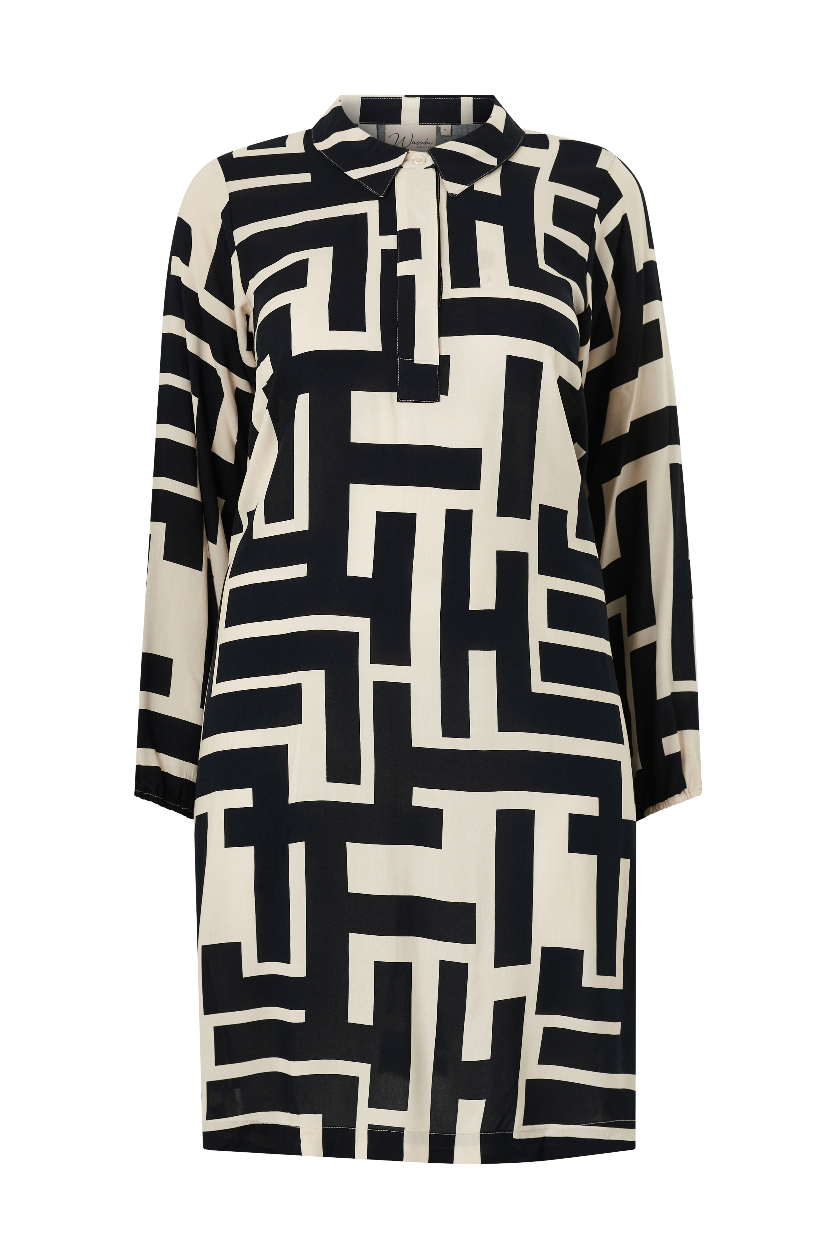 • Kjole i viskose• Krave• En synlig knap• Tre skjulte knapper• Lange ærmer med tynd elastik ved manchetterne• Store størrelser• Længde: 104 cm i størrelse S