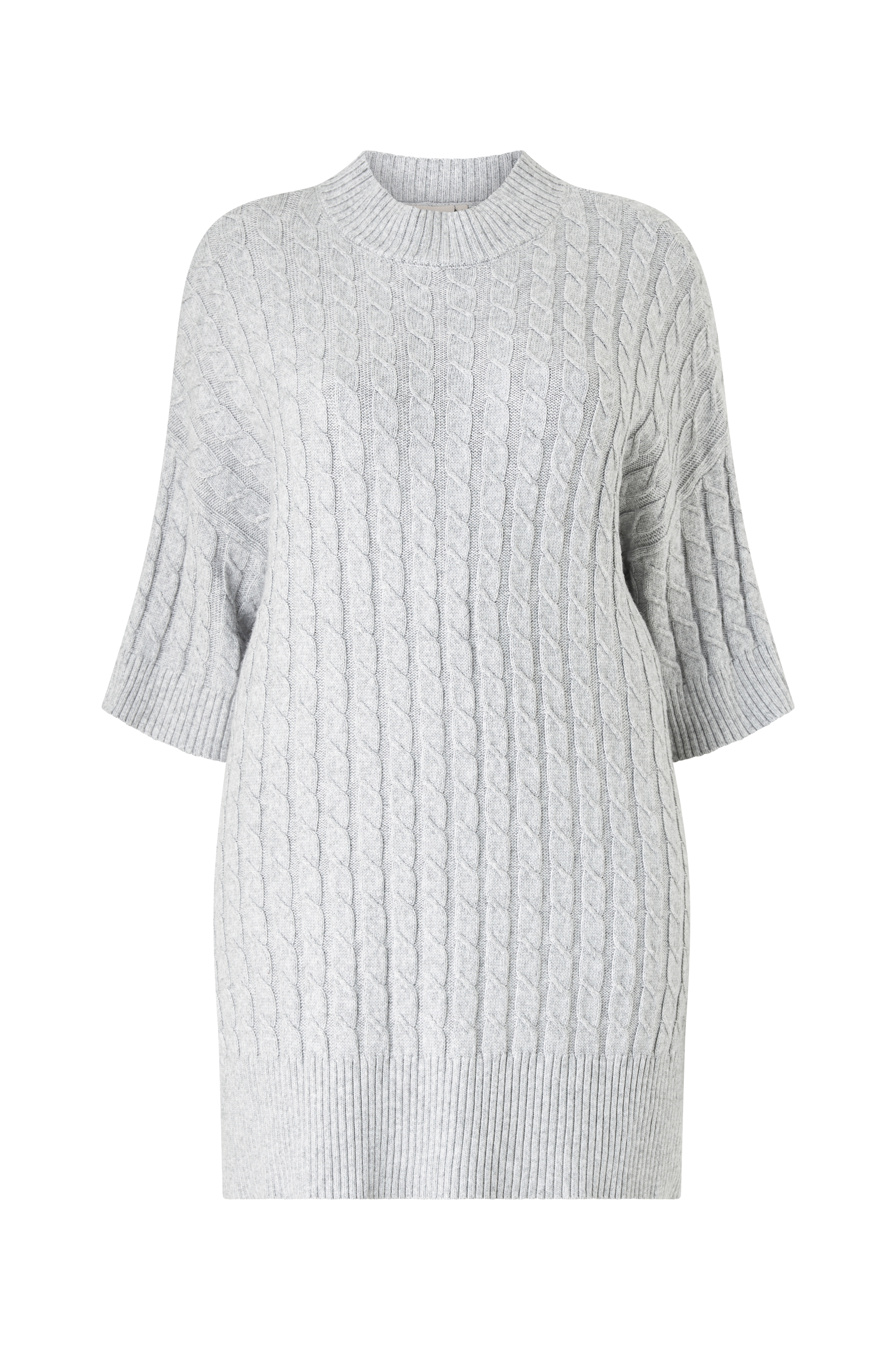 • Kabelstrikket kjole• Rund, ribbet, høj halsudskæring• Korte ærmer• Slidser i siderne• Ribstrik ved manchetterne og nederst• Store størrelser• Længde: 93 cm i størrelse S
