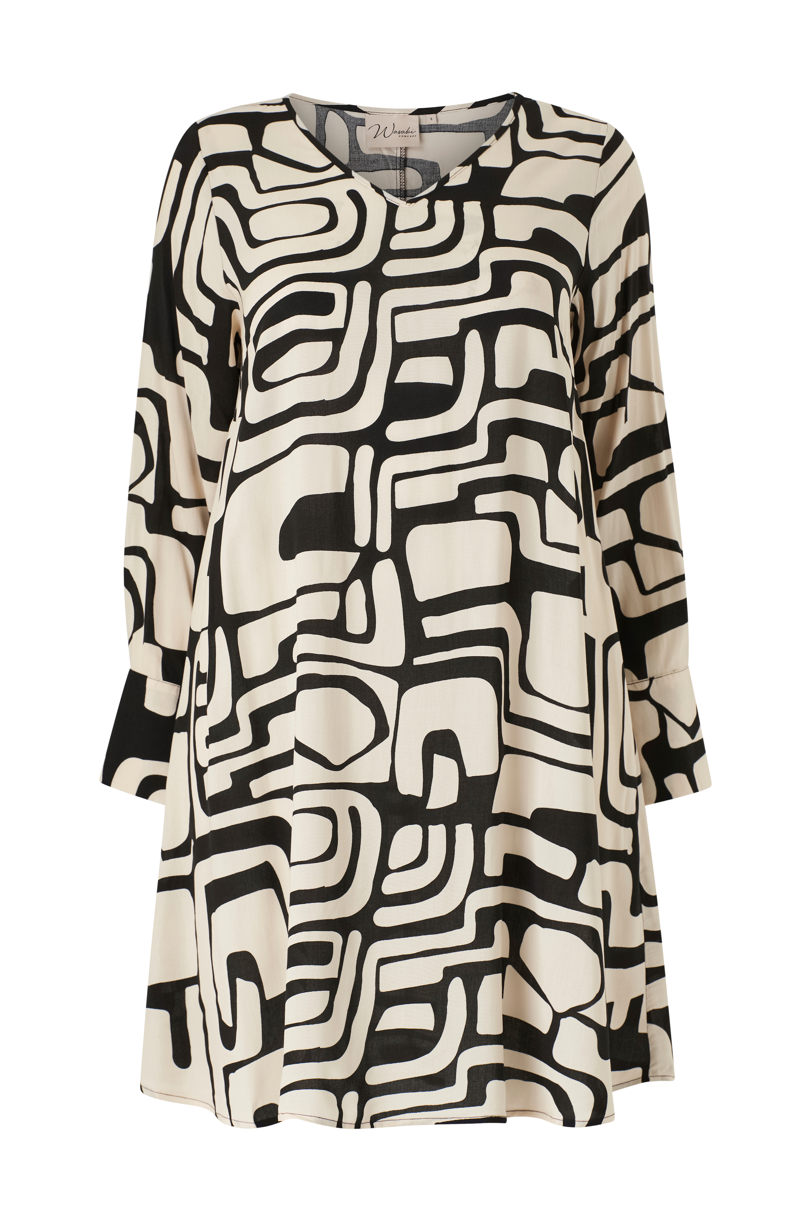 • Kjole i viskose med printet mønster• Afslappet A-linje design• V-formet halsudskæring• Lange ærmer• Manchet med en beklædt knap• Store størrelser• Længde: 103 cm i størrelse S