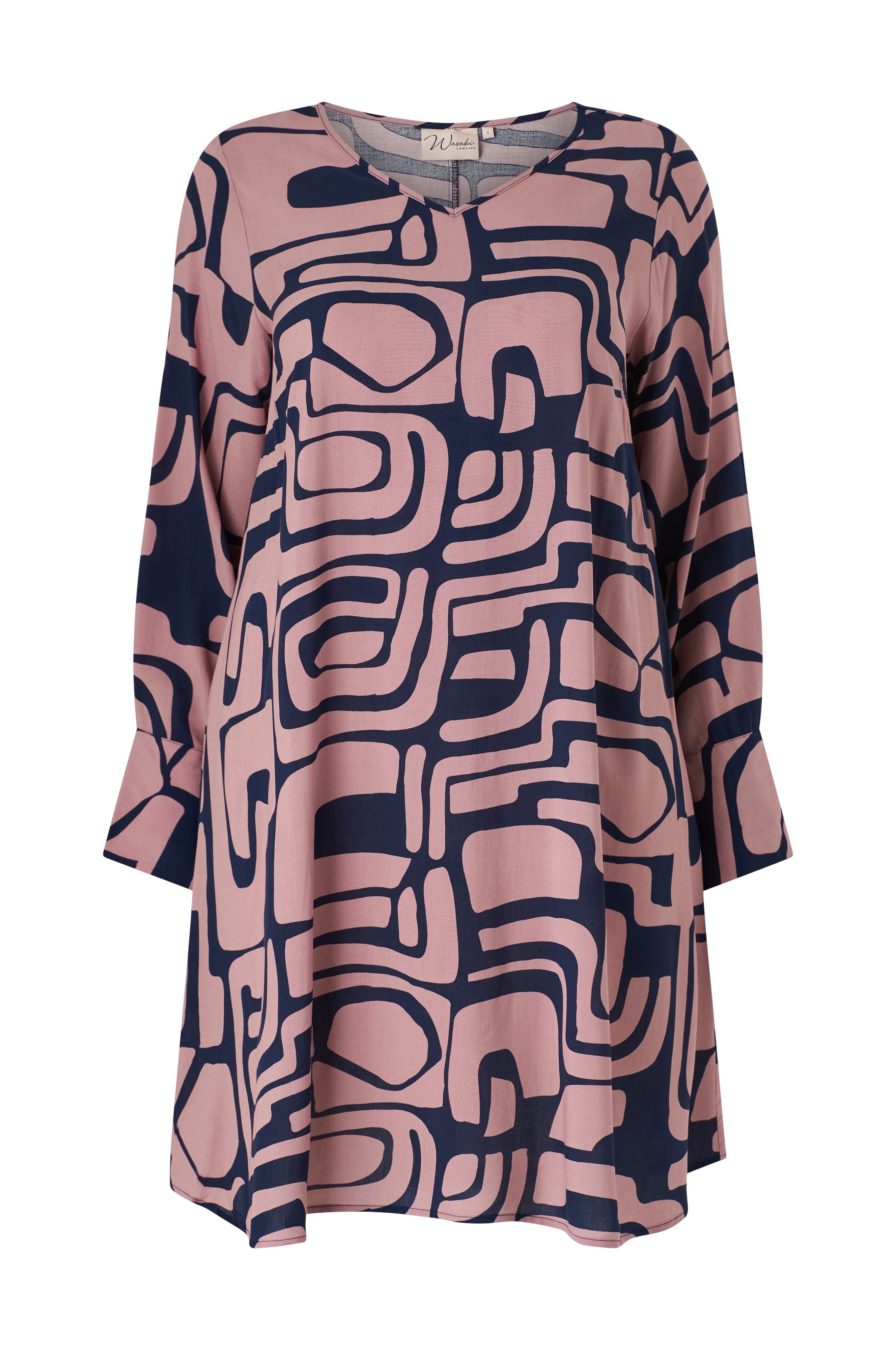 • Kjole i viskose med printet mønster• Afslappet A-linje design• V-formet halsudskæring• Lange ærmer• Manchet med en beklædt knap• Store størrelser• Længde: 103 cm i størrelse S