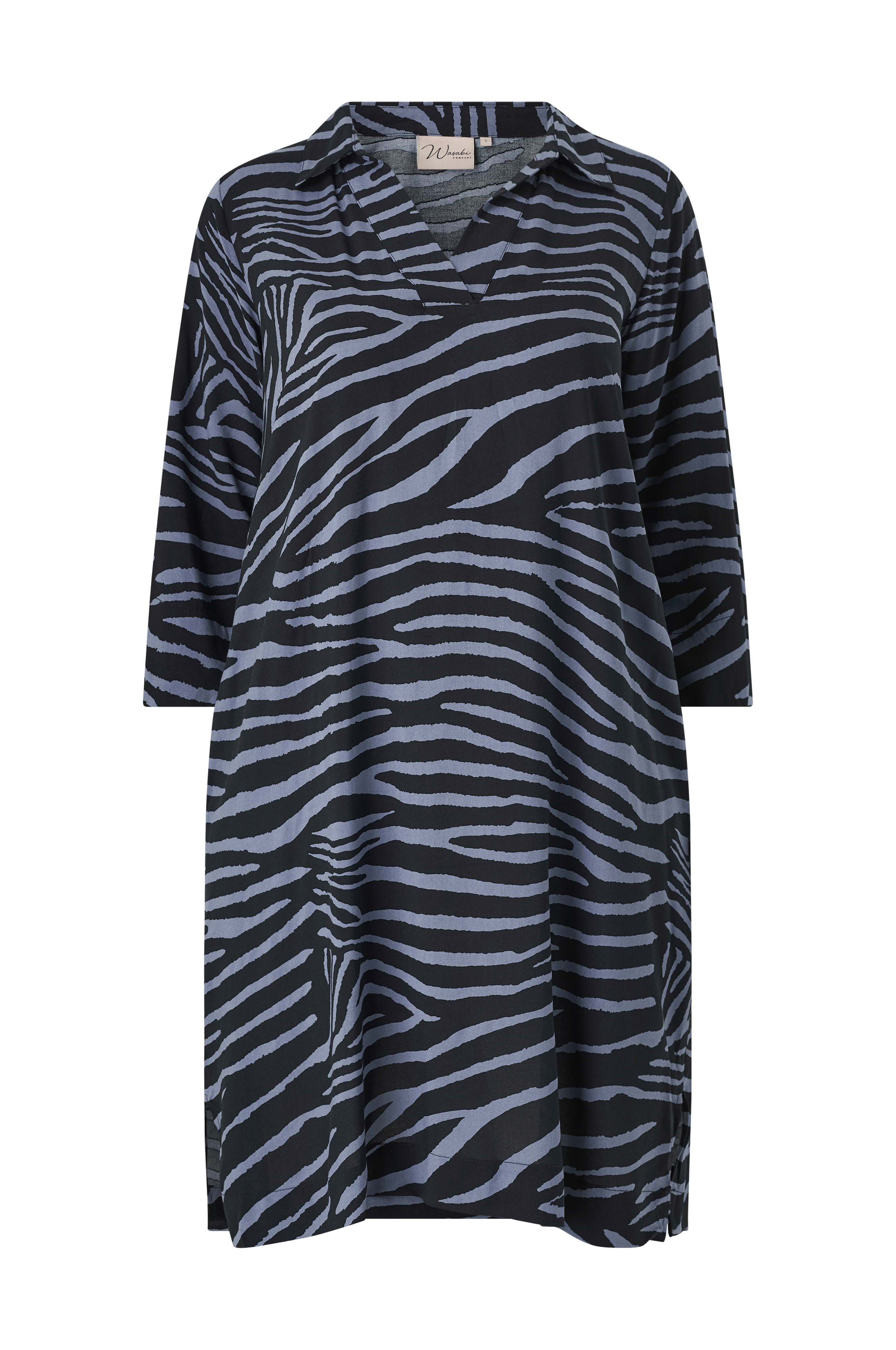 • Kjole i luftigt, zebramønstret materiale• Afslappet pasform med svaj• Lige, 3/4 lange arme• Lommer i siderne• V-hals med krave• Korte slidser i siderne• Stor størrelse• Længde: 106 cm i størrelse S