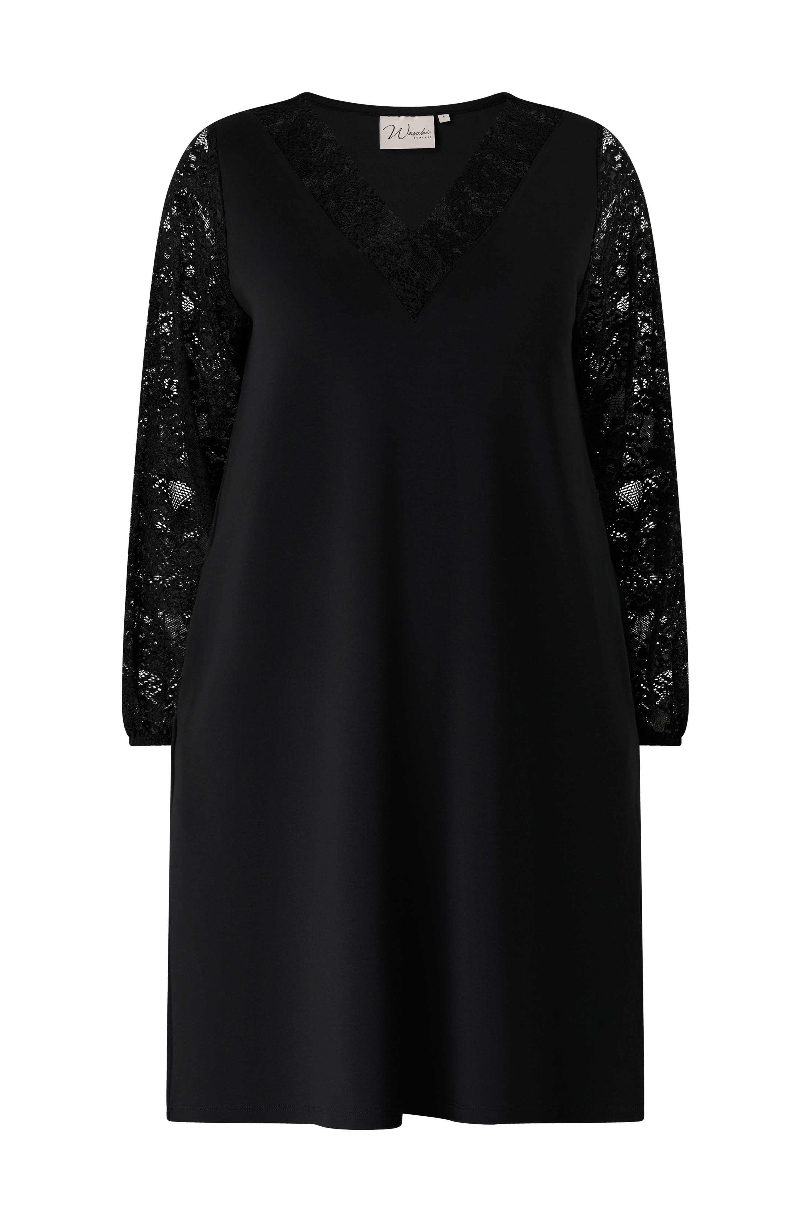 • Blød, elastisk kjole med afslappet pasform• V-formet halsudskæring med blondekant• Lange ærmer i blonde med elastiske ærmeafslutninger• Sidelommer• Plusstørrelser• Længde: 105 cm i størrelse S