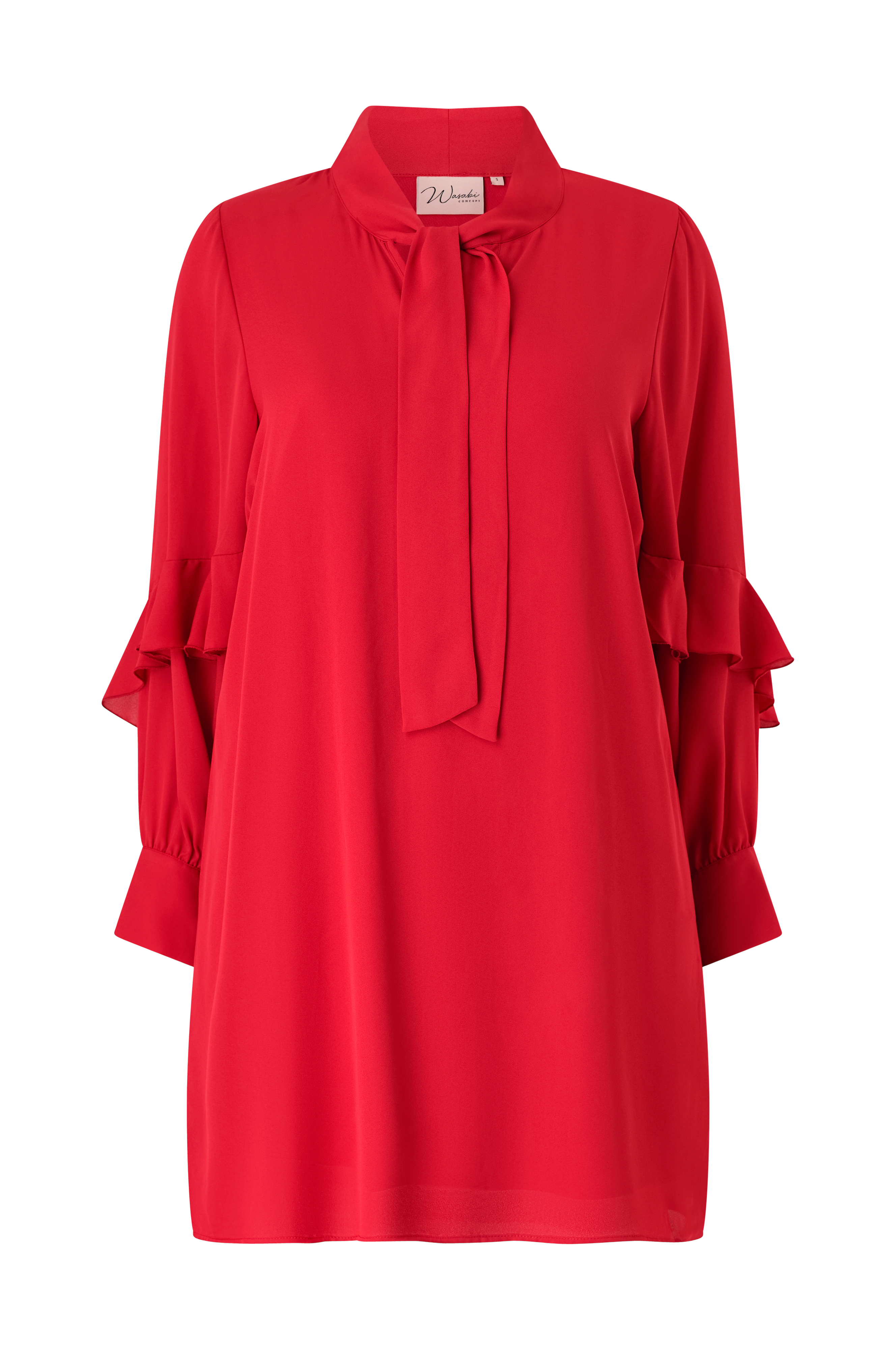 • Foret kjole med løs pasform• Rund halsudskæring med knudedetalje og slids• Lange ærmer med volanter og manchetter• Længde: 98 cm i størrelse S• Plusstørrelser