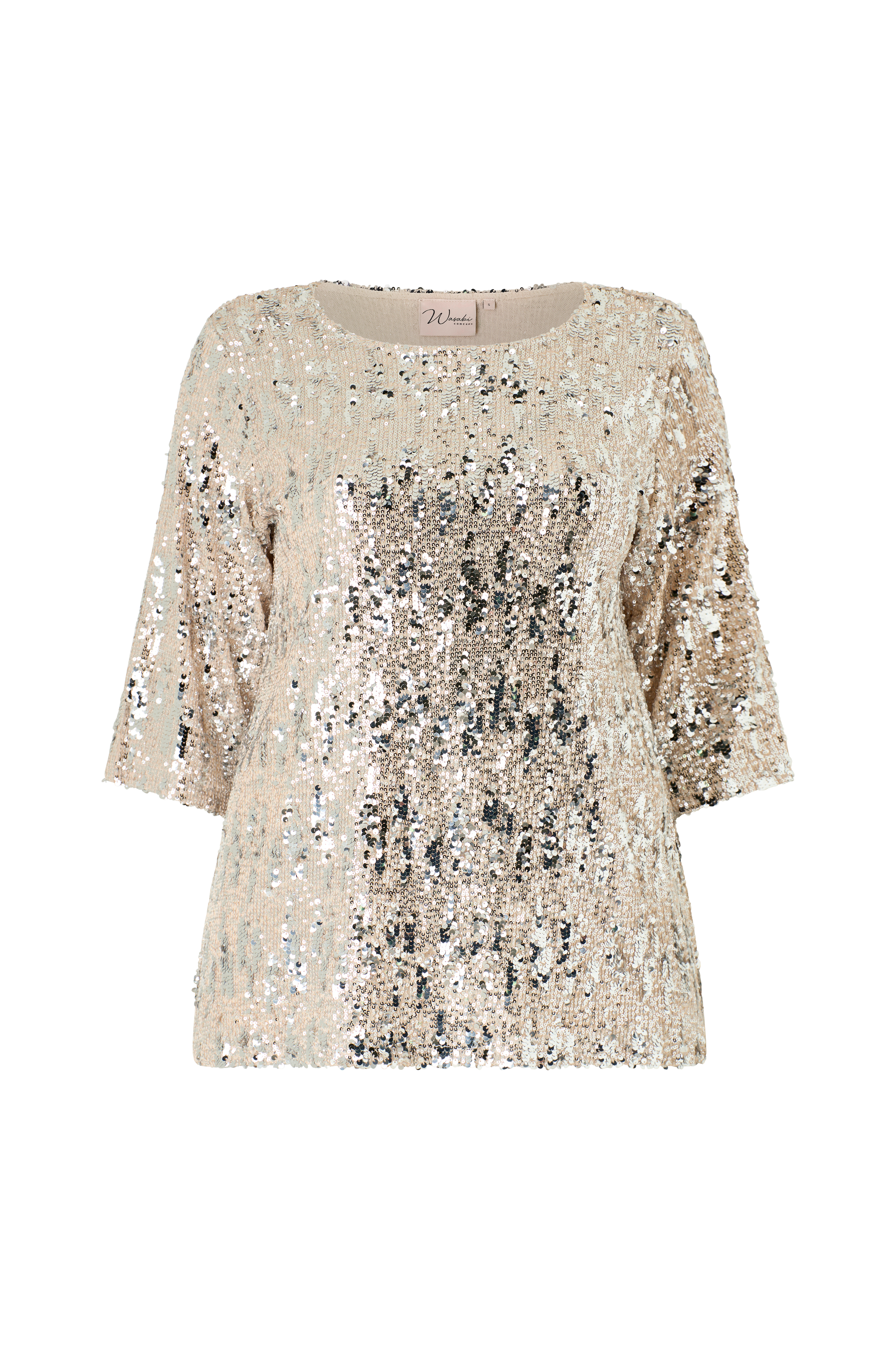 • Top i mesh med broderede pailleter overalt• Rund halsudskæring• 3/4 lange ærmer• Meshfor• Plusstørrelser