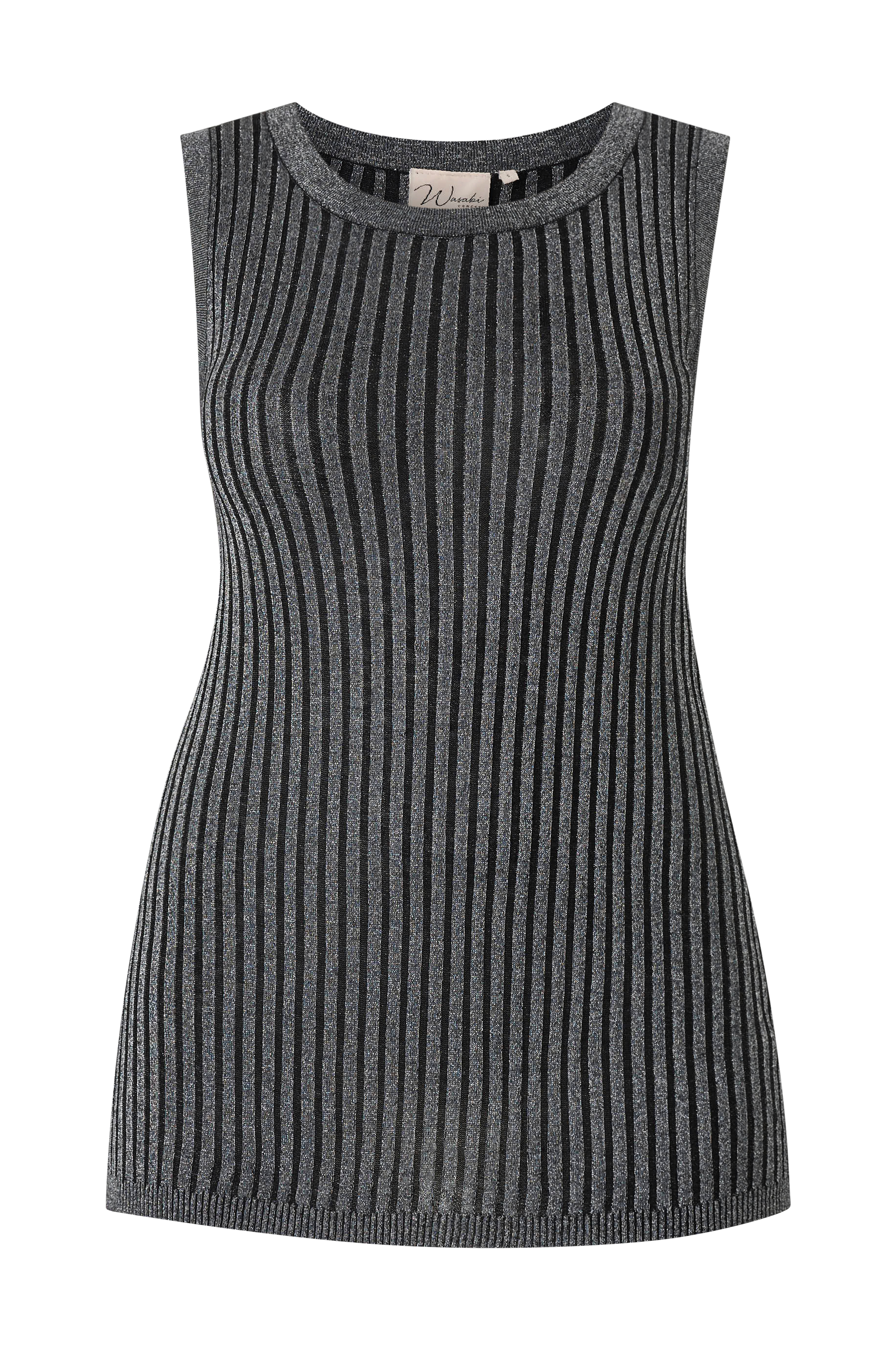 • Ærmeløs, fintstrikket top i glitrende materiale• Afrundet halsudskæring• Ribstrik ved nederste kant, i halsen og omkring ærmeåbningerne• Figursyet pasform med effekt med svaj nederst• Stor størrelse