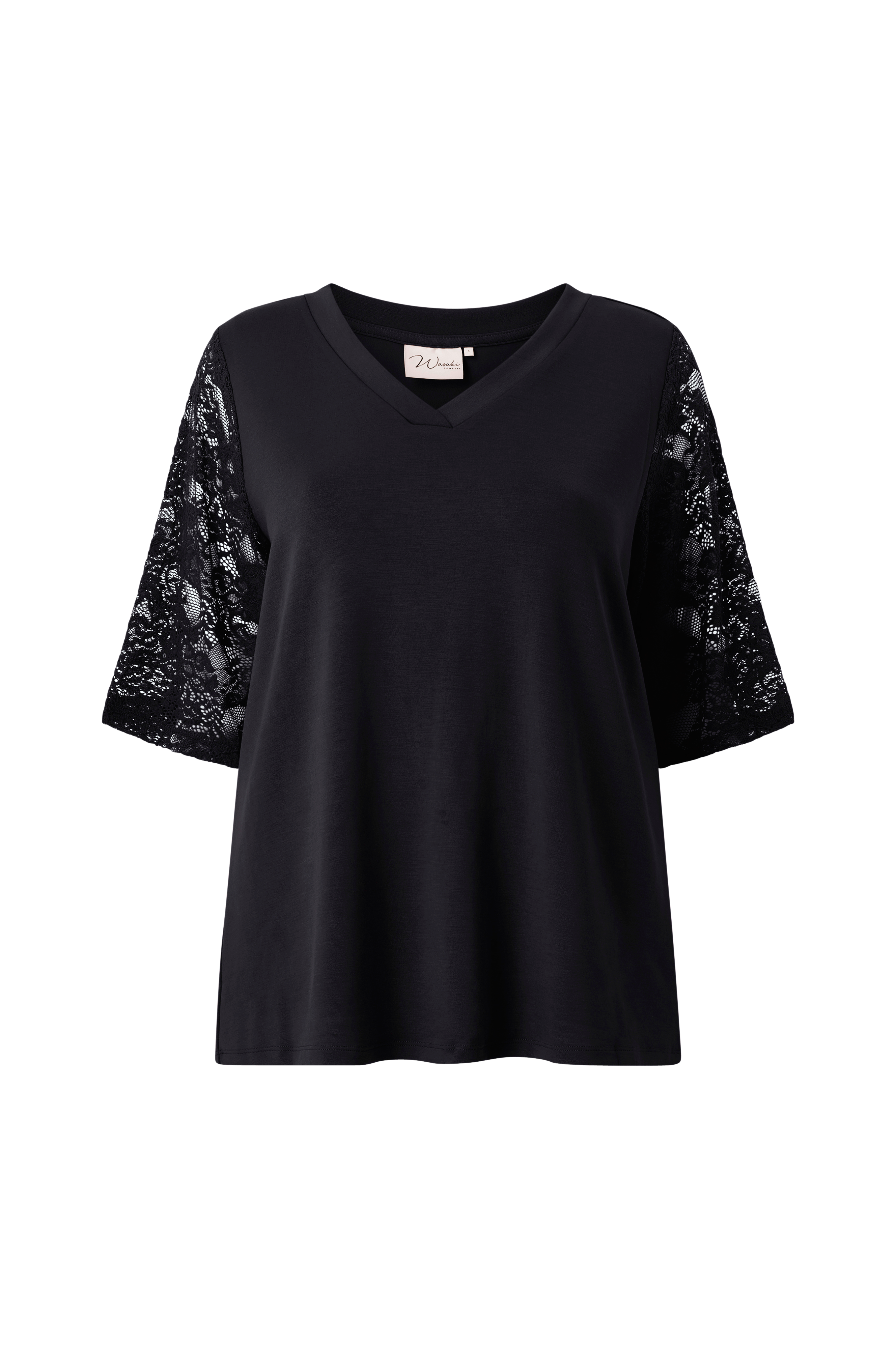 • Top i blød, elastisk jersey• V-formet halsudskæring• Halvlange ærmer i blonde• Plusstørrelser