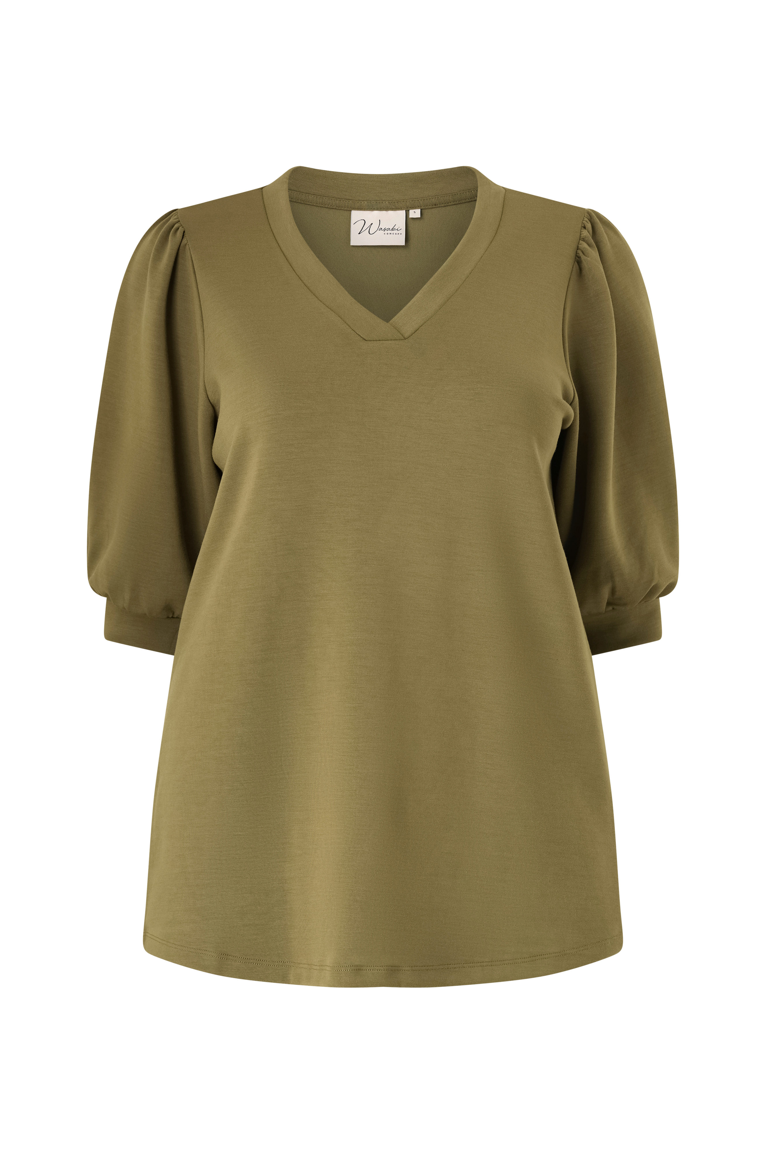 • Top i blød, elastisk jersey• V-formet halsudskæring• 3/4 lange ballonærmer med manchet ved manchetterne• Store størrelser