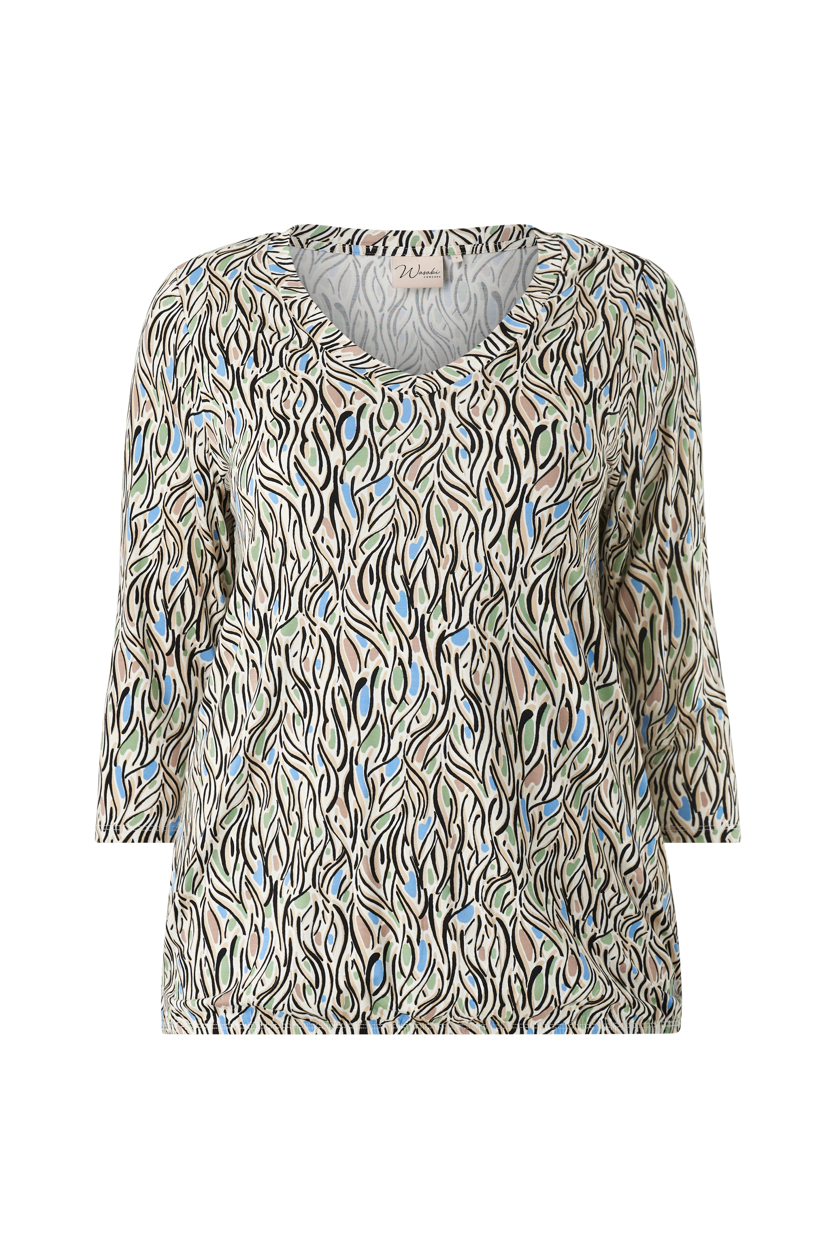 • Top i blød, elastisk lyocell• V-formet halsudskæring• 3/4 lange ærmer• Elastik ved nederste kant