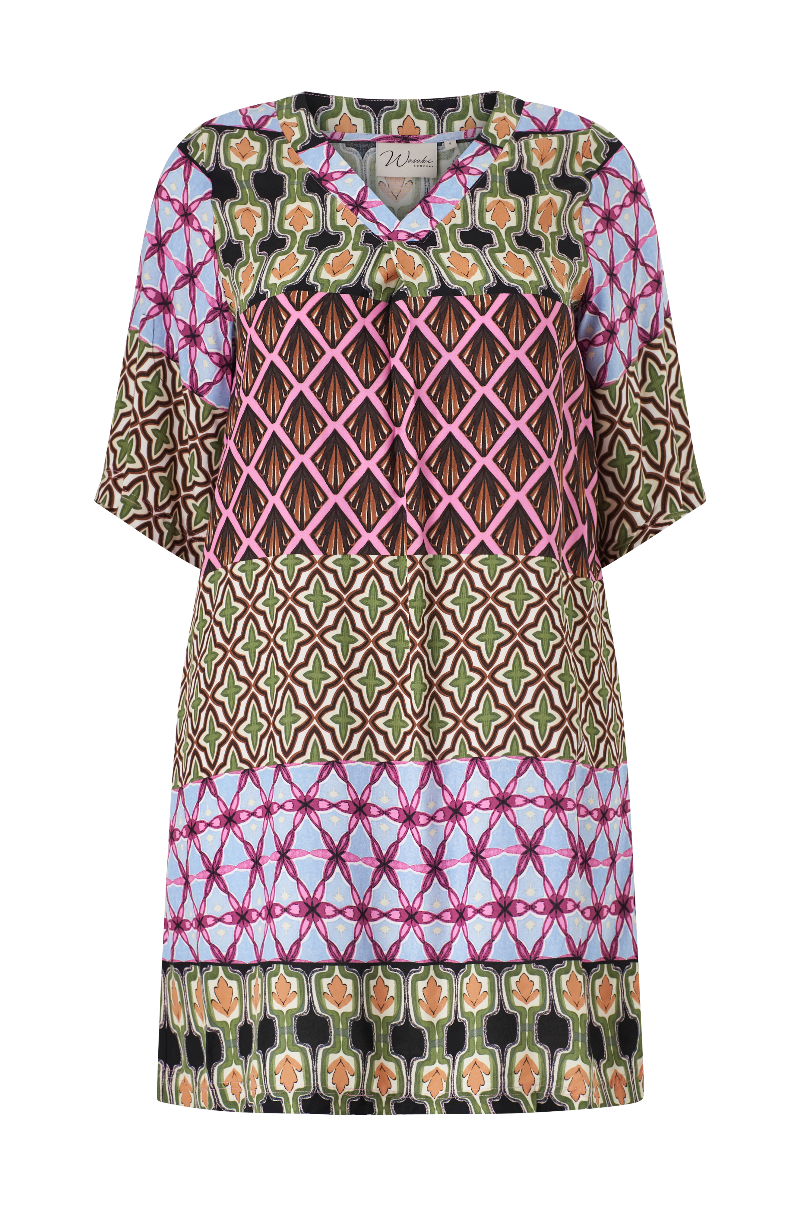• Mønstret tunika i viskose• Lige pasform med halvlange ærmer• V-formet halsudskæring• Bølgeformet detalje foran• Store størrelser• Længde: 102 cm i størrelse S