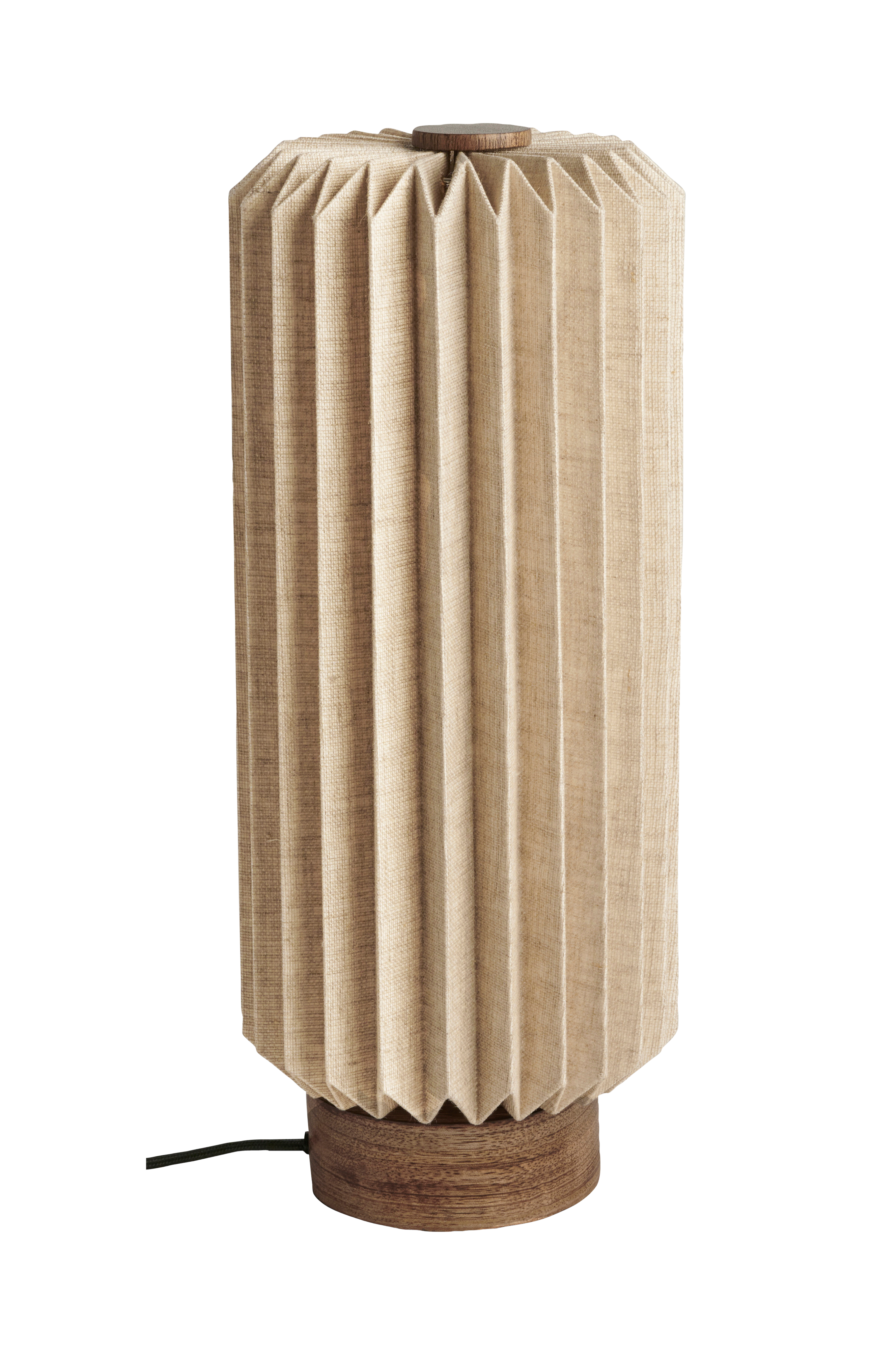 Alba table er en smukt plisseret bordlampe i naturfarvet hør. Foden er lavet af mørkbejdset mangotræ, som giver en blød kontrast til hørstoffet. Når lampen er tændt, lyser den med et blødt, dæmpet skær og passer godt enten i en vindueskarm eller på et lille sidebord. Alba leveres med en sort, elegant tekstilledning.