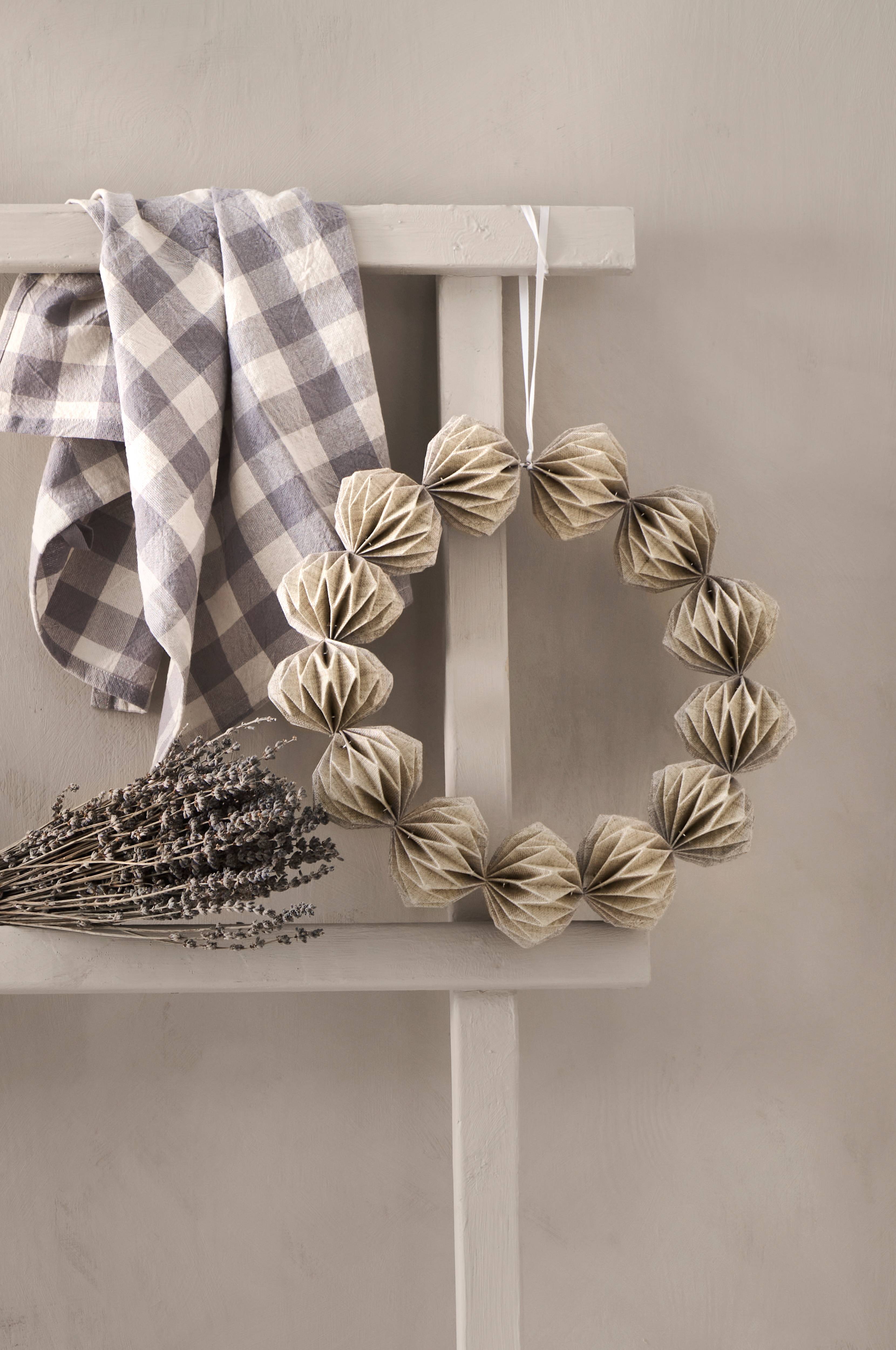 Naturfarvet krans med håndfoldede, diamantformede kugler dækket med hørstof. Det grafiske udtryk giver Linn et moderne præg, men hørstoffet emmer af tradition ligesom den jul, vi alle elsker.