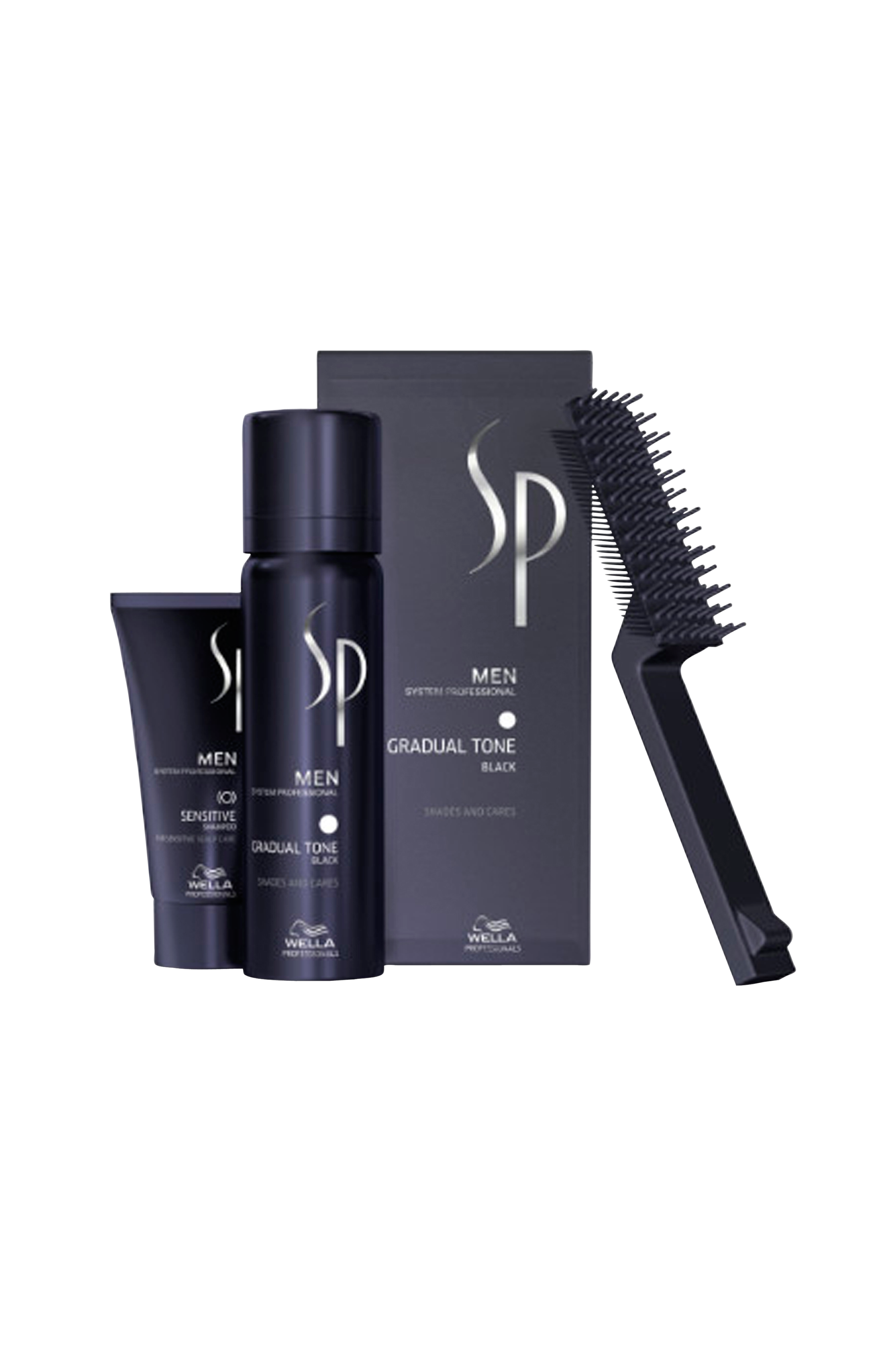 Wella SP Men Gradual Tone Black er perfekt til en subtil farvning. Den fine mousse gendanner gradvist en naturlig, sort nuance ved at dække alle hårstrå som er op til 70 procent grå. Desuden nærer den håret og beskytter det takket være en specielt udviklet formel, der bruger luft til at oxidere pigmentet og C-vitamin for et yngre udseende.Fordele:Gradual Tone Black Mousse bliver gradvist mørkere for en farveløs farvningsproces og genskaber et smukt og naturligt hårlook.Hyperallergen og dermatologisk testet produkt.Anvendelse: Påfør i tørt eller håndklædetørret hår. Ryst produktet. Brug medfølgende handsker og børste fra pakken og påfør moussen i hele håret eller dele af håret. Lad det sidde i 5 minutter. Lad den første påføring sidde i 10 minutter. Massér derefter moussen ind, skyl håret grundigt og vask det med Sensitive SP Men Shampoo. Påfør produktet hurtigt for en nem og jævn effekt.