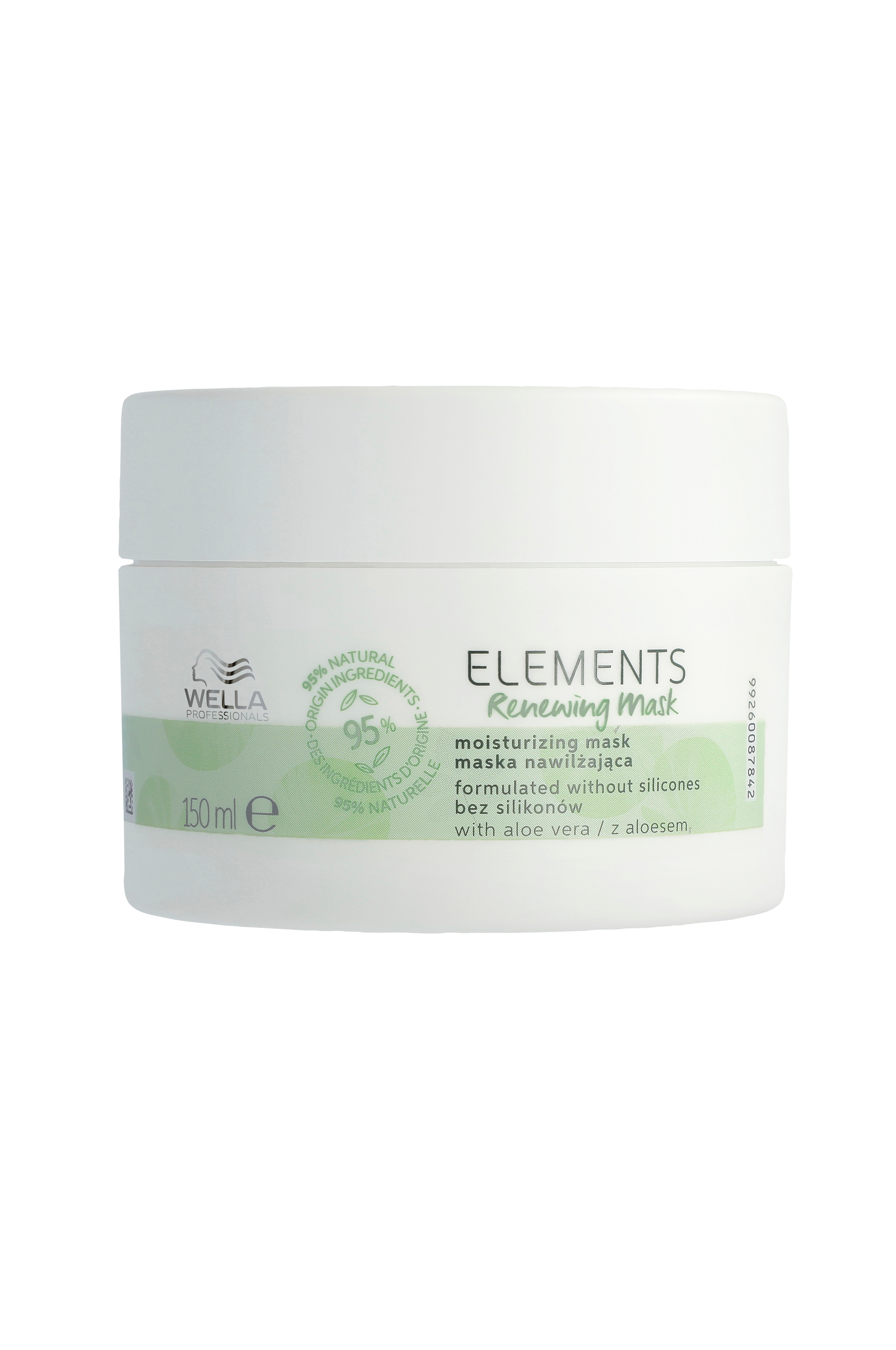 Wella Professionals Elements Renewing Mask er en fugtgivende hårmaske uden silikone. Lavet med ingredienser af 95% naturlig oprindelse, denne fugtgivende hårpakke genopretter glathed og glans til håret for et sundt udseende og følelse. Elements Hair Mask med intensivt nærende egenskaber får håret til at føles dybt fugtet.