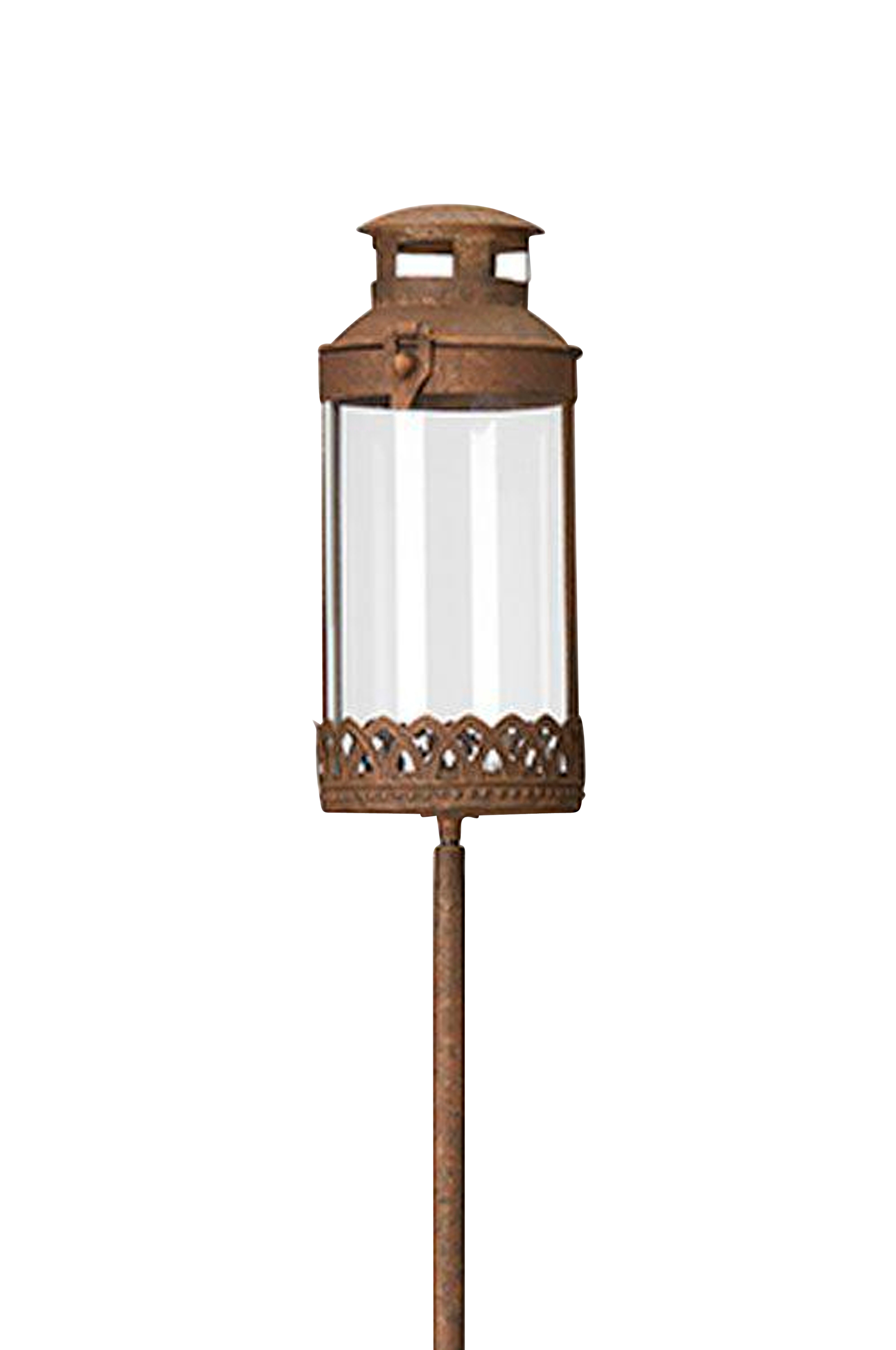 Lanterne på pind, af rustfarvet metal. Højde 23 cm og diameter 9 cm. Indv. mål er 8 cm.