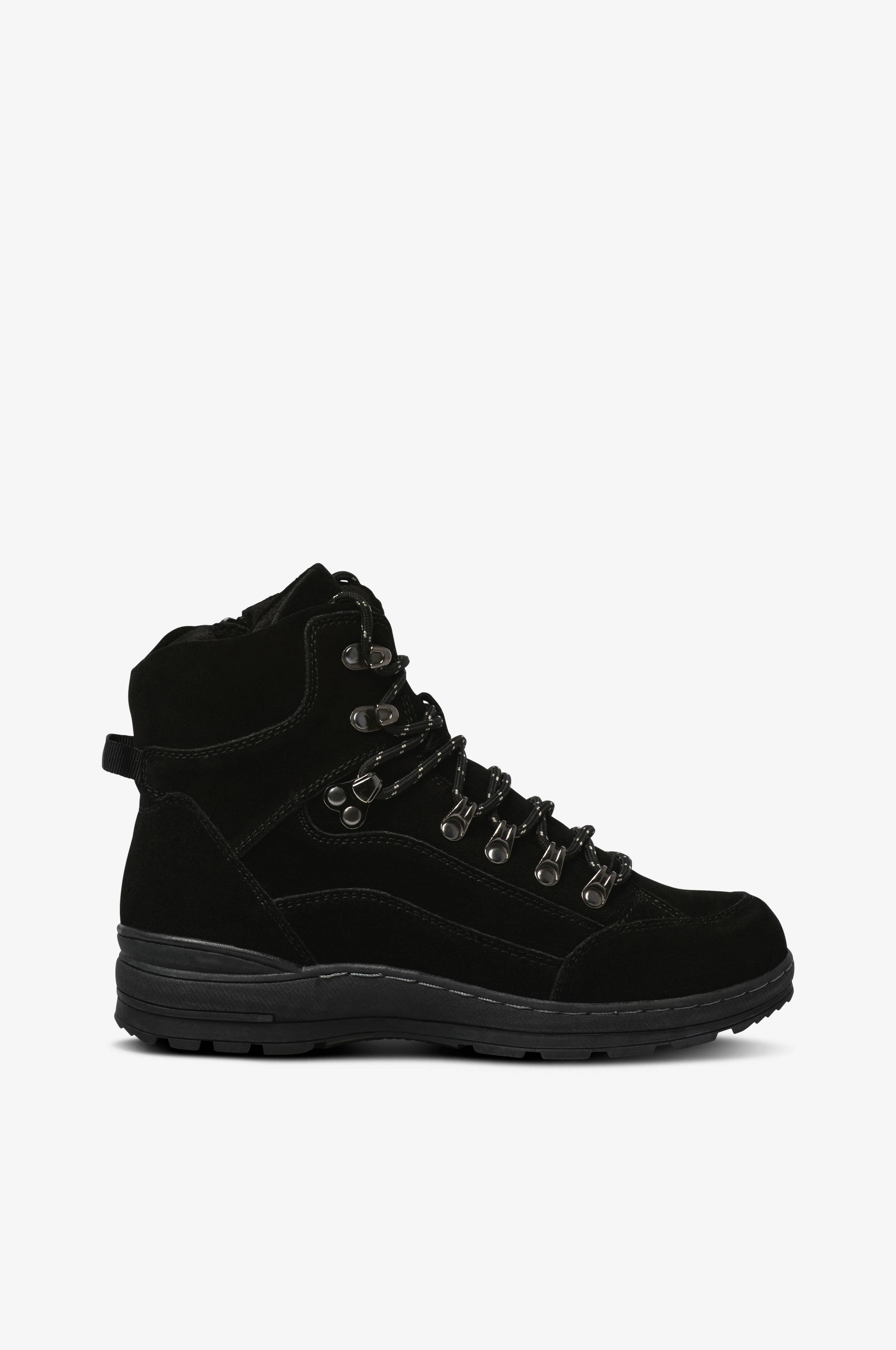 Støvle i ruskind med for i blød kunstpels. Bred snøre med hægter. Vatteret skaftkant for komfort.Skafthøjde ca. 10 cm.