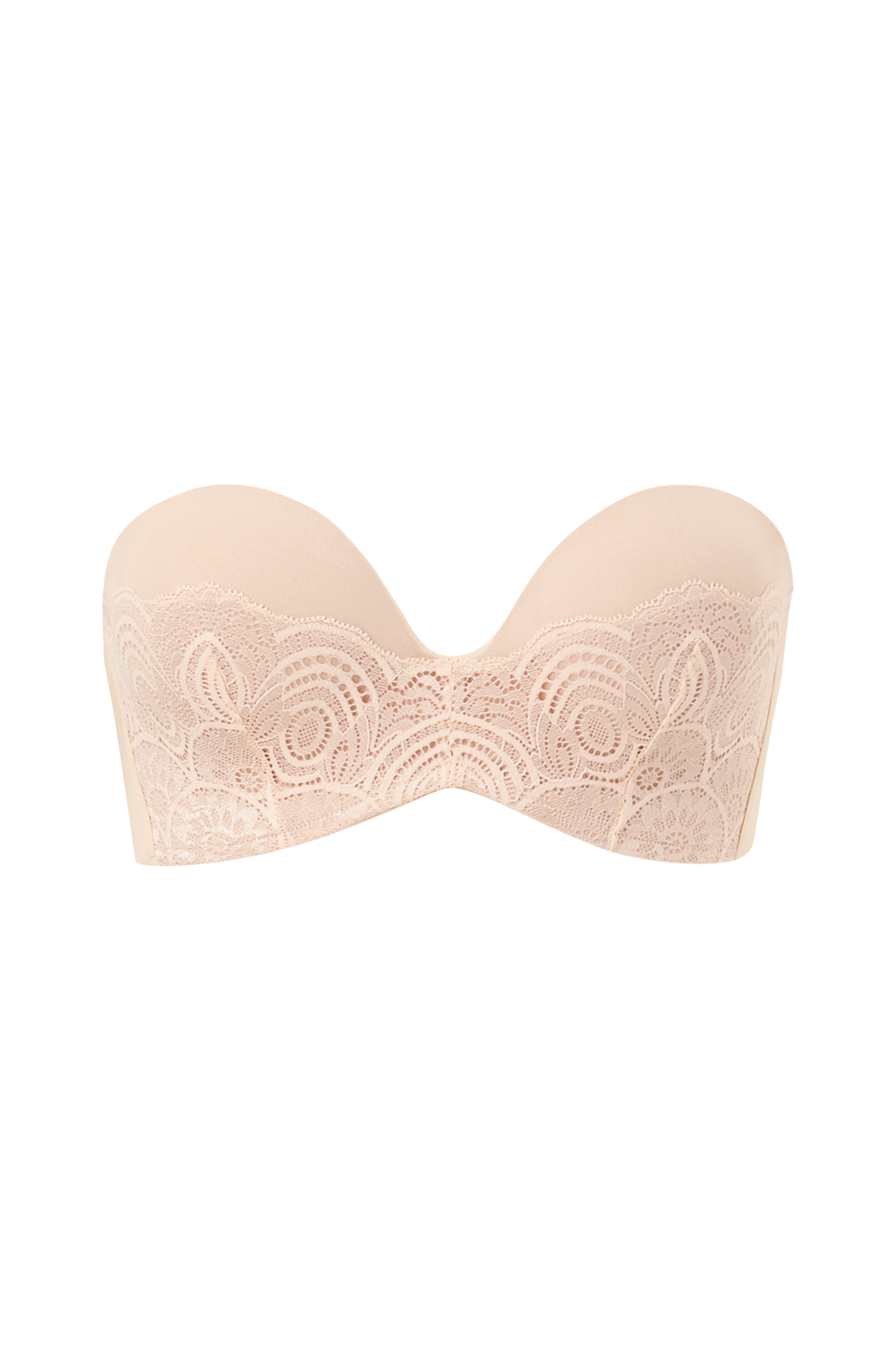 Stropløs bh med formpressede, vatterede skåle med dekorativ blonde. Unik konstruktion gør at bh'en sidder perfekt uden bøjler. Silikonekant i siderne og bagpå. Hægte- og mallelukning i ryggen.